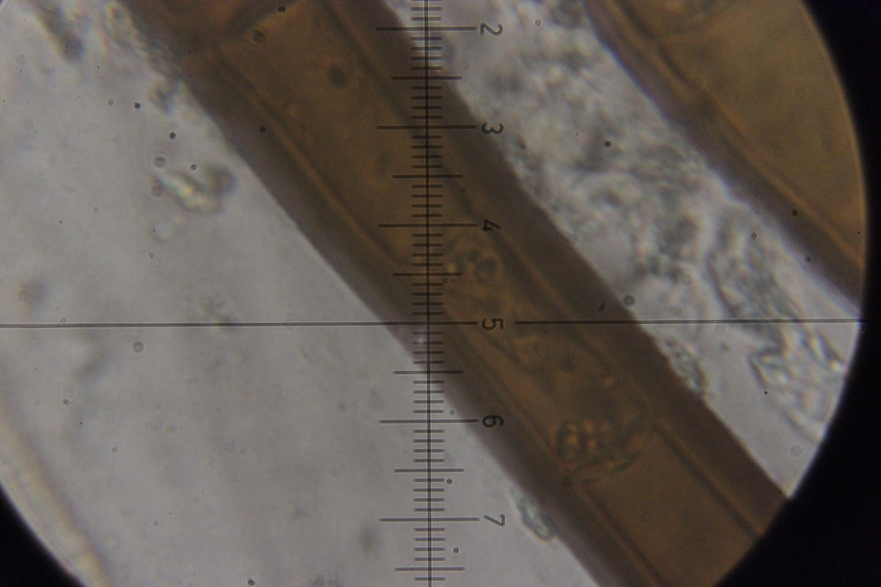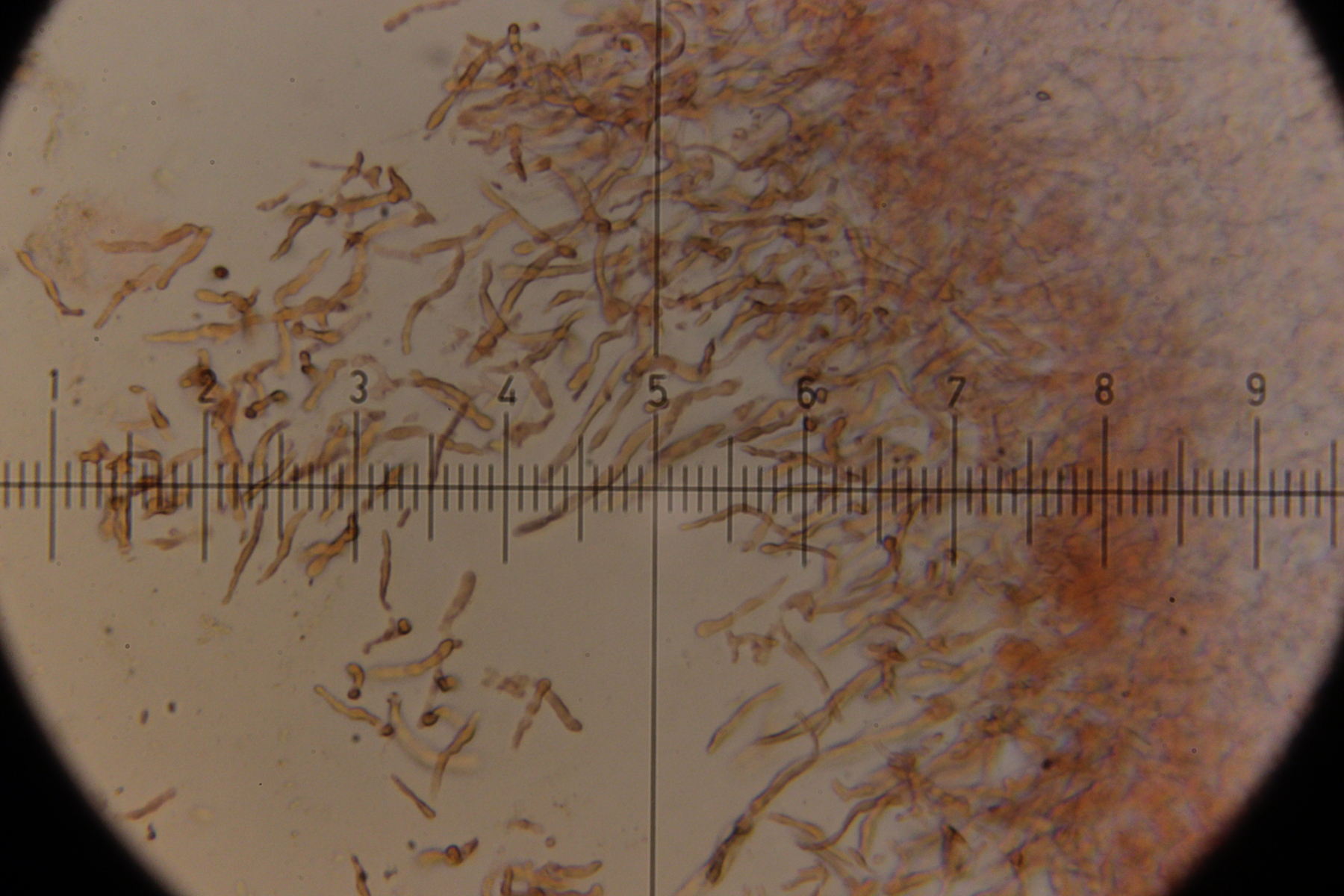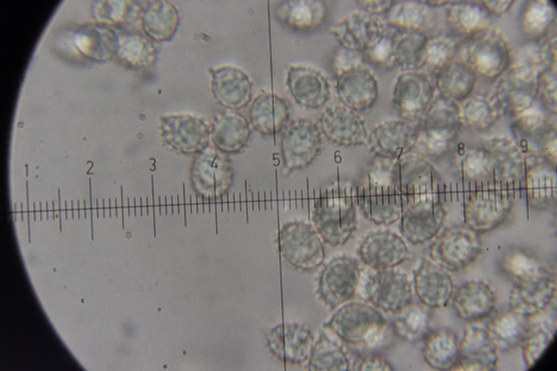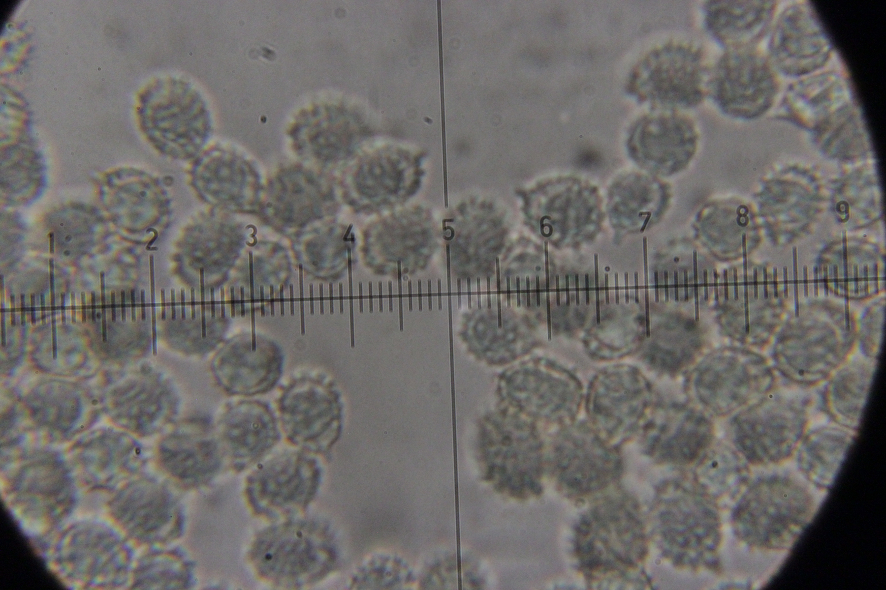 6. Eine Scutellinia. Sporengröße (19.4 +- 0.7 ) x (13.3 +- 0.5) µm, Asci 195-220 µm lang und 16-23 µm breit. Randhaare 400-470 µm lang, 23 µm breit, Wanddicke 4-5 µm. Sporen warzig und mit vielen Öltröpfchen. Auffällig die geteilten Paraphysen. Fruchtkörper waren sehr groß (geschätzt >1 cm Durchmesser) und wuchsen im Morast auf totem organischen Material wie Eicheln, Stöckchen und Blättern.