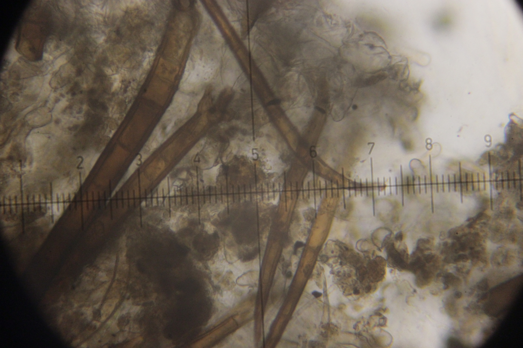 6. Eine Scutellinia. Sporengröße (19.4 +- 0.7 ) x (13.3 +- 0.5) µm, Asci 195-220 µm lang und 16-23 µm breit. Randhaare 400-470 µm lang, 23 µm breit, Wanddicke 4-5 µm. Sporen warzig und mit vielen Öltröpfchen. Auffällig die geteilten Paraphysen. Fruchtkörper waren sehr groß (geschätzt >1 cm Durchmesser) und wuchsen im Morast auf totem organischen Material wie Eicheln, Stöckchen und Blättern.