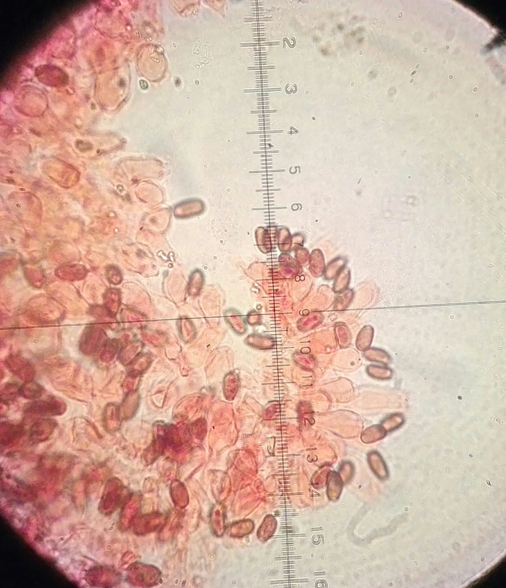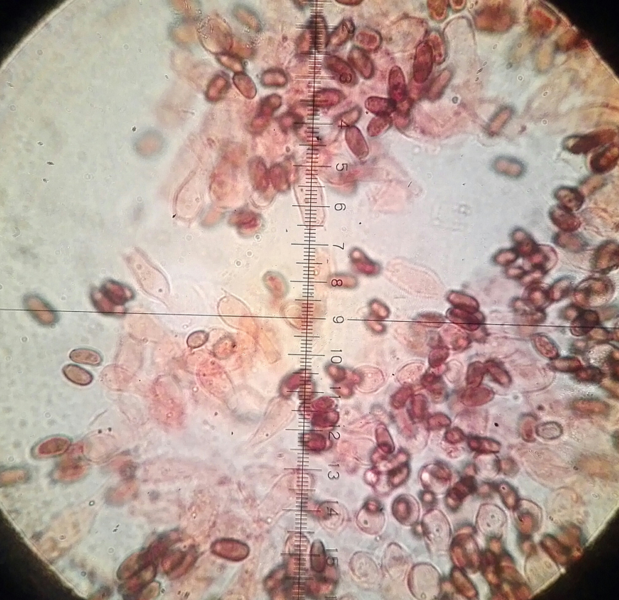 die Sporengröße ist 7,5-9,5 x 4-4,5 - meist 9x4. Die Sporen sind bohnenförmig, würde ich sagen. Zystiden konnte ich keine finden, nur jede Menge Basidien.