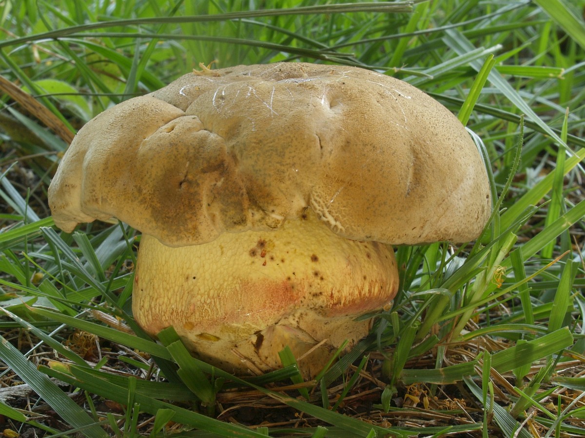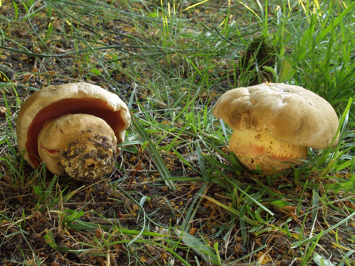 Gestern informierte mich ein Pilzfreund über den möglichen Fund eines Satansröhrlings, von dem aber die Röhren noch nicht zu sehen waren. Da mir nur ein Fundort am Niederrhein in Krefeld bekannt war, trafen wir uns heute am frühen Morgen in Mönchengladbach und hatten schnell Klarheit. Standort war ein Lindenstreifen in der Nähe eines Teiches und Begleitpilze einige Netzstielige Hexenröhrlinge. Die etwas düstere Hutfarbe ist wohl der Trockenheit, den hohen Temperaturen und dem Wind zu verdanken. Die etwas schwachen Rottöne am Stiel liegen wohl noch innerhalb der Variaionsbreite. Ich kann mir jedenfalls nichts Anderes vorstellen.