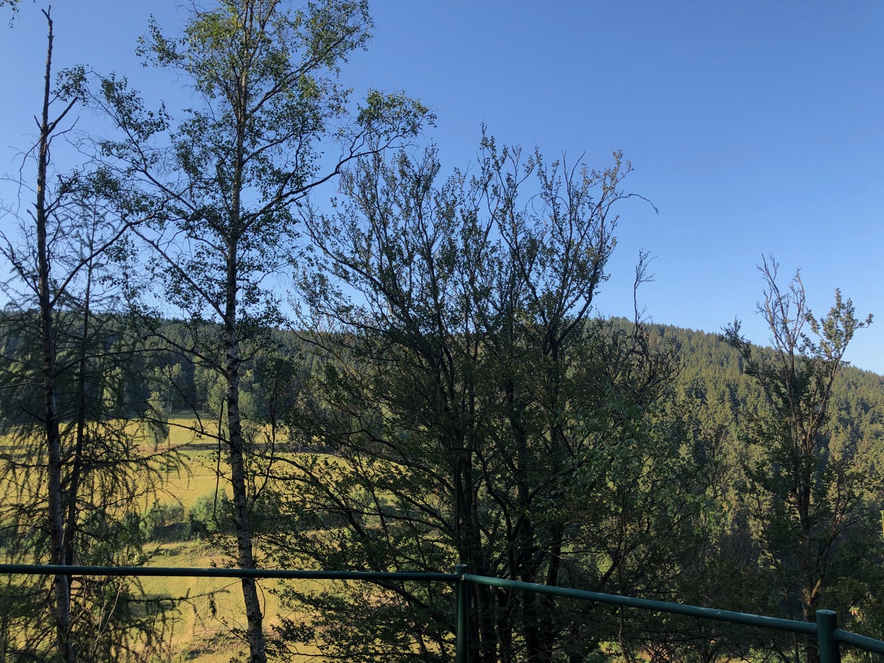 Eine Birke tot, die andere geschädigt, kranke buchen und die Kühe die gegenüber die Hänge extensiv beweiden wurden vor zwei Wochen weggebracht. Kein Gras mehr.