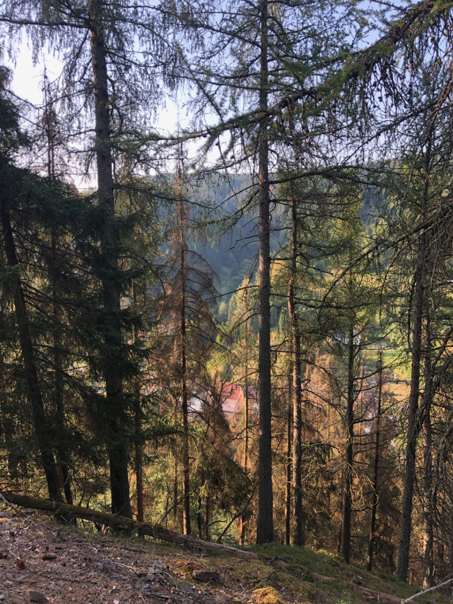 Ein Stück weiter verabschieden sich weitere Lärchen, die Fichten sind schon kaputt.