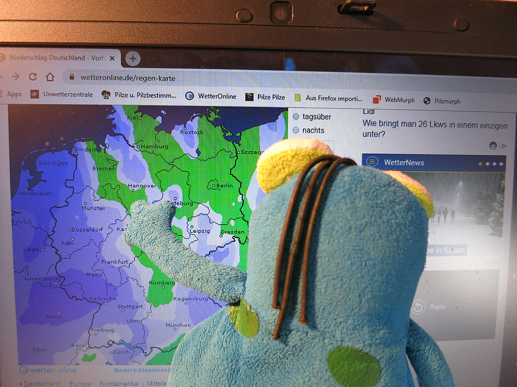 irgendwann muss doch auch einmal etwas bei dir ankommen. Bei mir sind gerade 28 Stunden Dauerregen zu Ende gegangen was dem Pilzwachstum in nächster Zeit zu Gute kommen müsste. Mal sehen wieviel es insgesamt geworden ist. Ich habe heute früh erst einmal eine halbe Stunde lang meinen Regenschirm gesucht da ich den in den letzten Jahren nicht mehr gebraucht hatte.