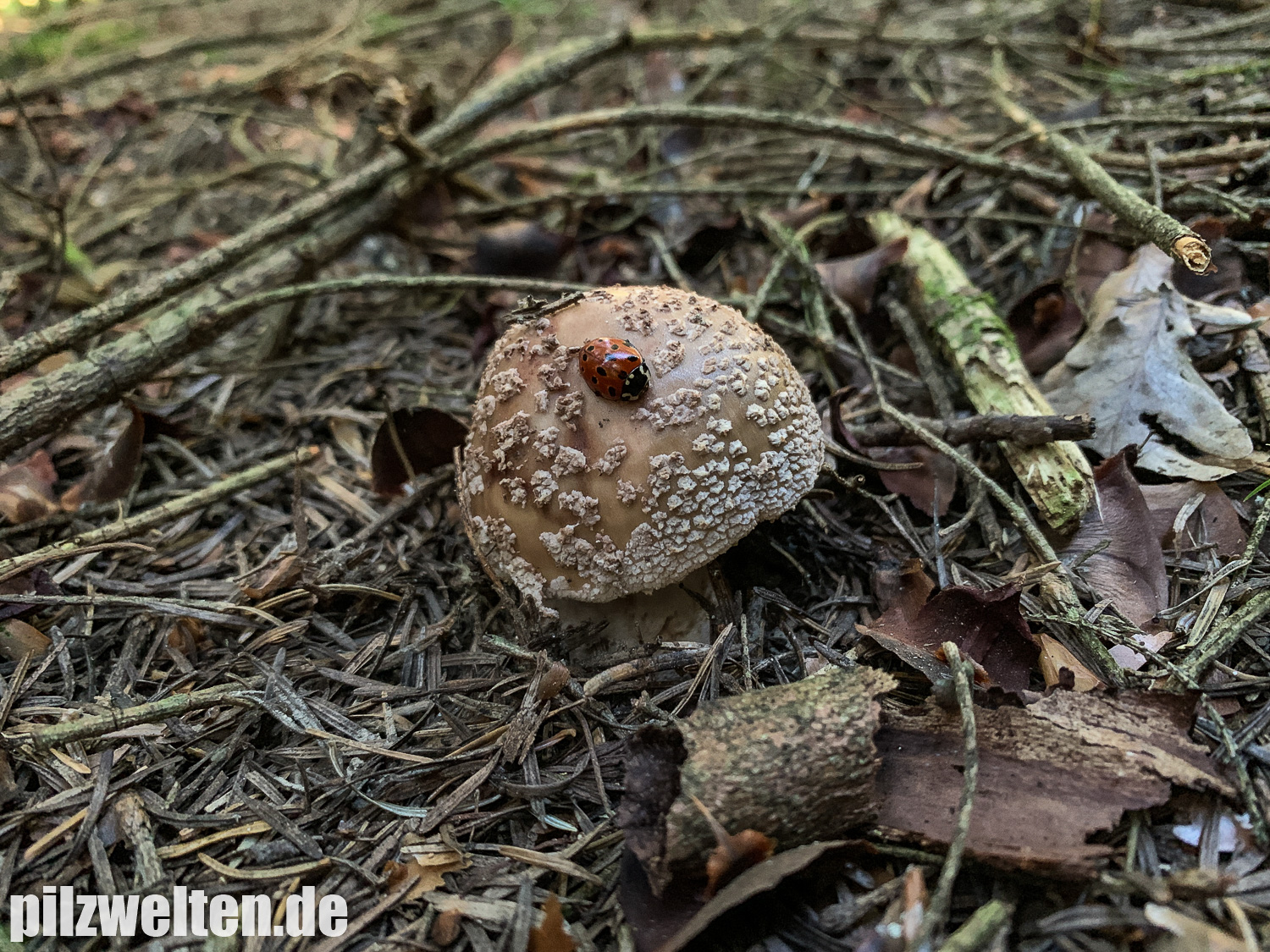 5. Perlpilz, Rötender Wulstling, Amanita rubescens (mit vermutlich dem Asiatischen Marienkäfer, Harmonia axyridis)