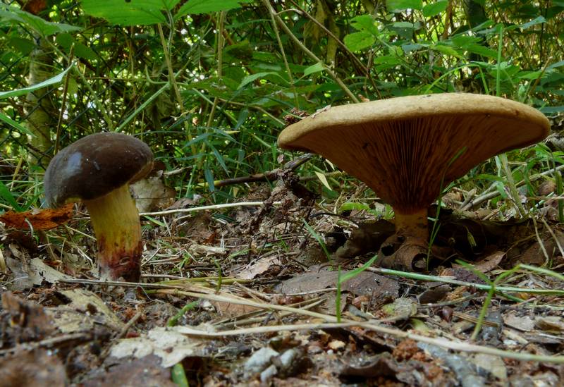 Bild 1 zeigt zwei Pilze, von denen der linke evtl ein Steinpilz sein könnte?
