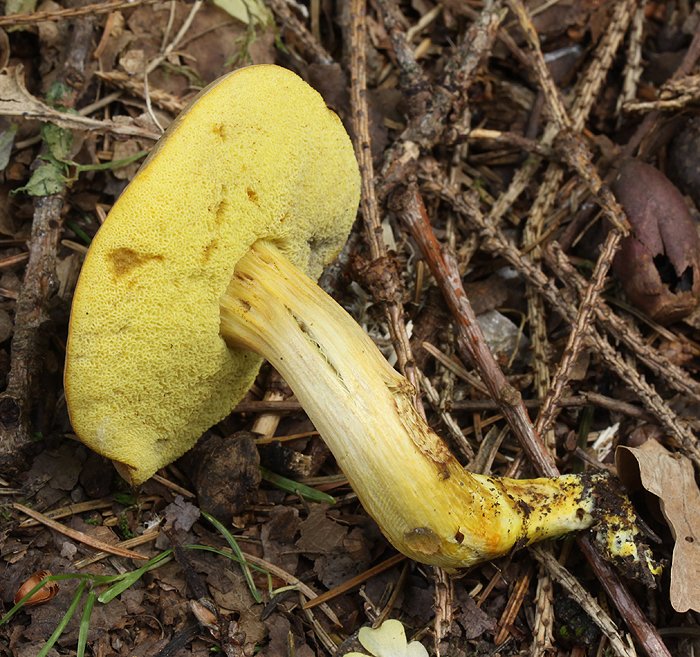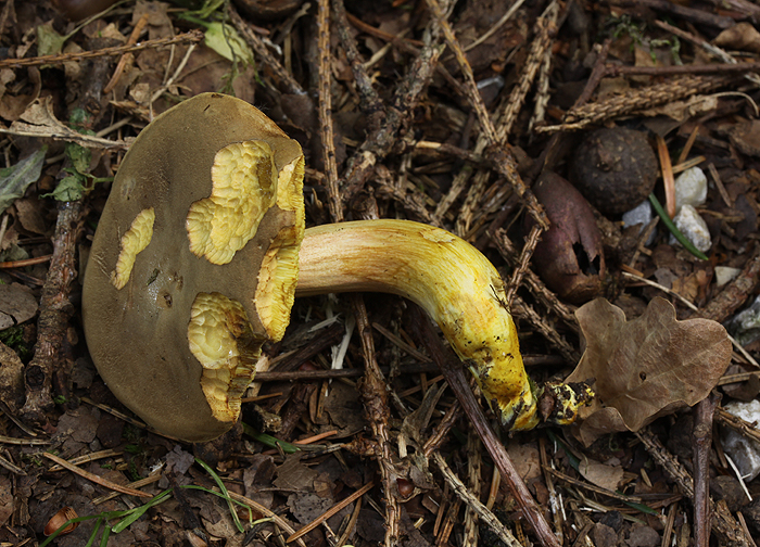 Die Bestimmung ist anhand der Hutfarbe, der karottenorangen Bereiche der Stielbasis und der kurzen Sporen m.E. völlig klar. Auch die Stieloberfläche passt sehr gut. Ergo Hortiboletus engelii in Penzberg (zusammen mit Russula insignis, die nur wenige Meter entfernt wuchs).