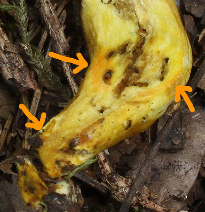 Schneidet man den Pilz durch, so findet man hier sogar mehrere karottenrote Bereiche (unteres Bild, Pfeile), wobei der oben links am deutlichsten ausgeprägt ist.