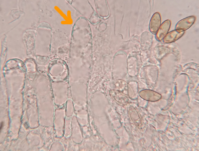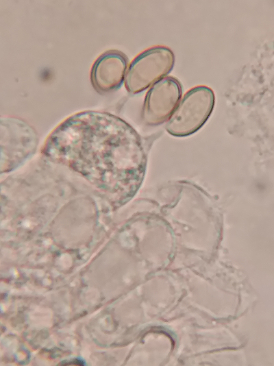 Die Basidien wiederum sind auffallend aufgebläht, deutlich breiter als der Sterigmenansatz. Sie messen ca. 36-51 x 13,5-16 µm.