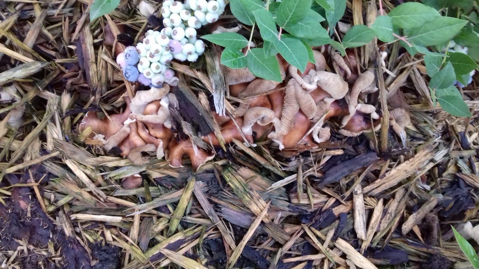 Noch zur Info: Wie auf den Bildern zu sehen, wachsen die Pilze gerne in Gruppen auf feuchtem Boden mit Nadelholz-Späne (Tanne, Fichte). Die Beeren sind zur Größenorientierung mit drauf. Der Boden ist ziemlich sauer (pH etwas unter 5), das sind optimale Bedingungen für die Beeren.