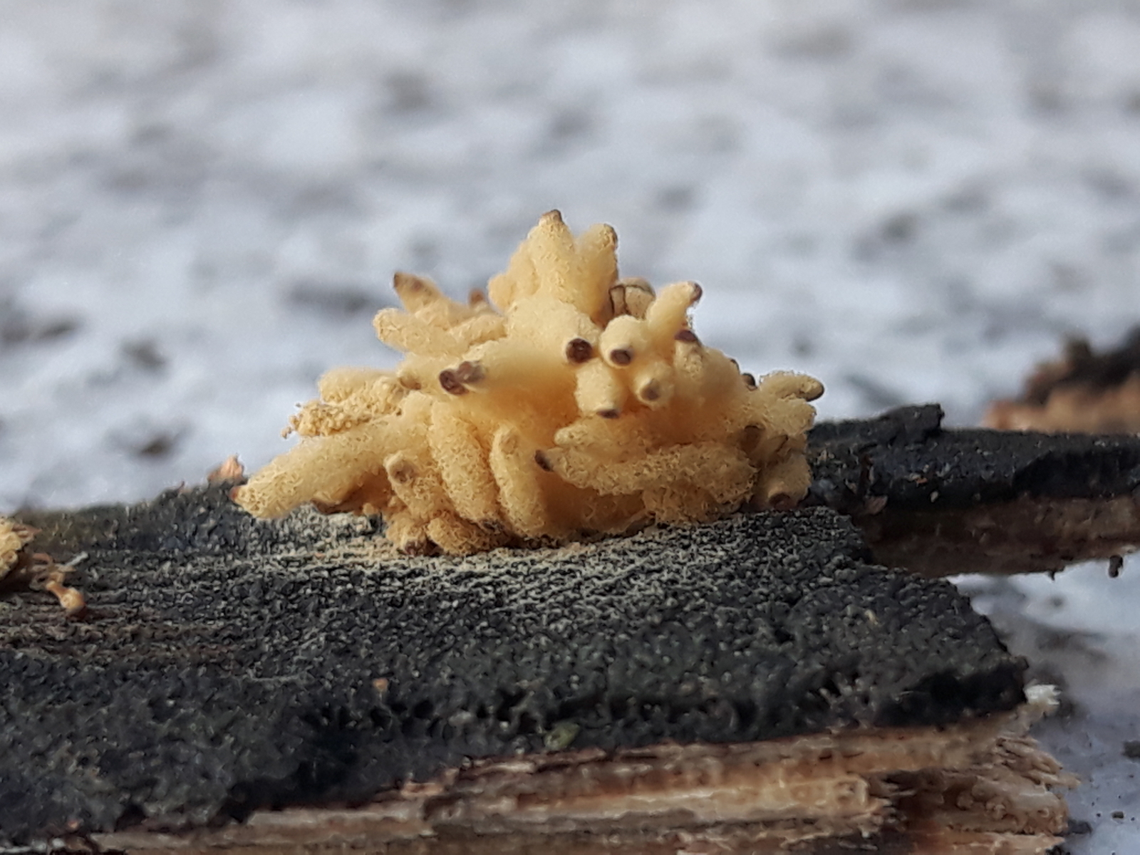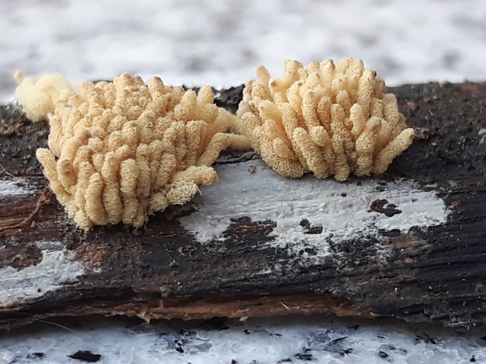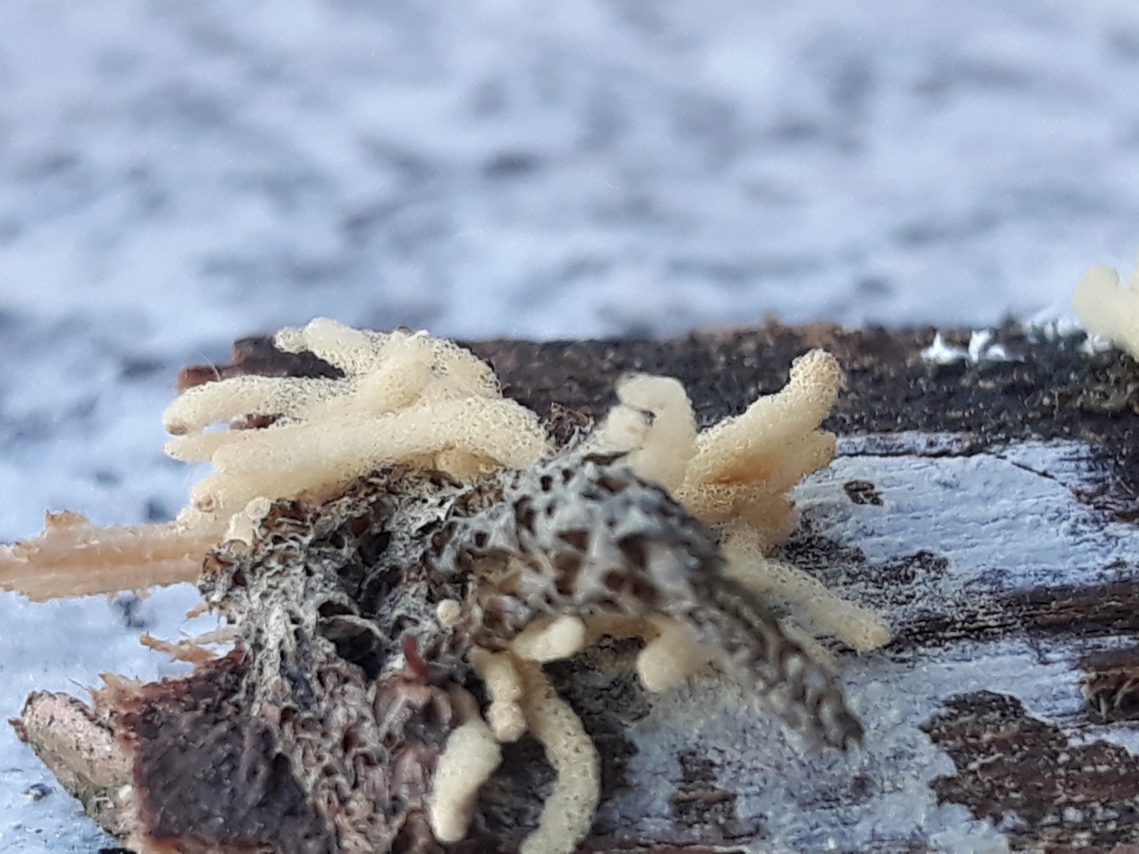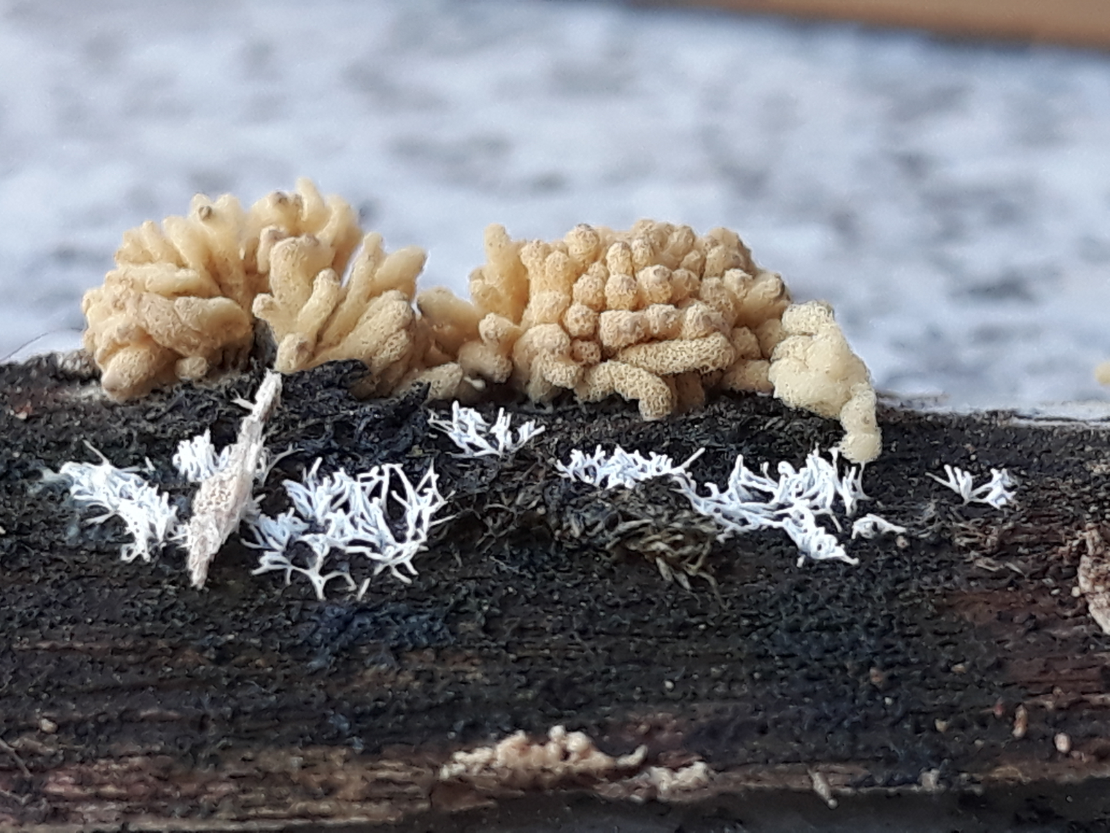 Die weißen länglichen Teilchen neben der Arcyria ist ein weitere Schleimpilz: Ceratiomyxa fruticulosa, schon etwas angetrocknet.