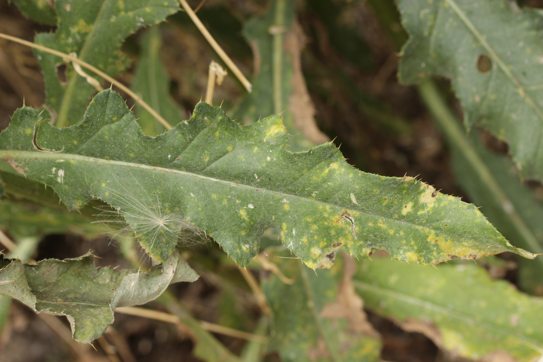 12. Hier bin ich unsicher. Die Pflanze schein Cirsium arvense zu sein, womit der Pilz Puccinia punctiformis wäre. Aber irgendwie kenne ich den nur mit massiverem Befall. Oder handelt es sich hier um eine Sekundärinfektion, die im Klenke und Scholler erwähnt wird?