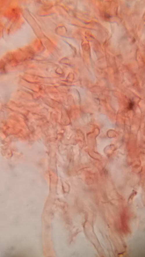 Schnallen musste ich suchen, da das Subiculum sehr dicht gepackt ist und subbasidial die Hyphen auch schlecht auflösbar sind. Schnallen sind aber vorhanden - und der Schnallenbogen kann sehr unterschiedlich ausgeprägt sein - hier Beispiele von relativ normalen Schnallen: