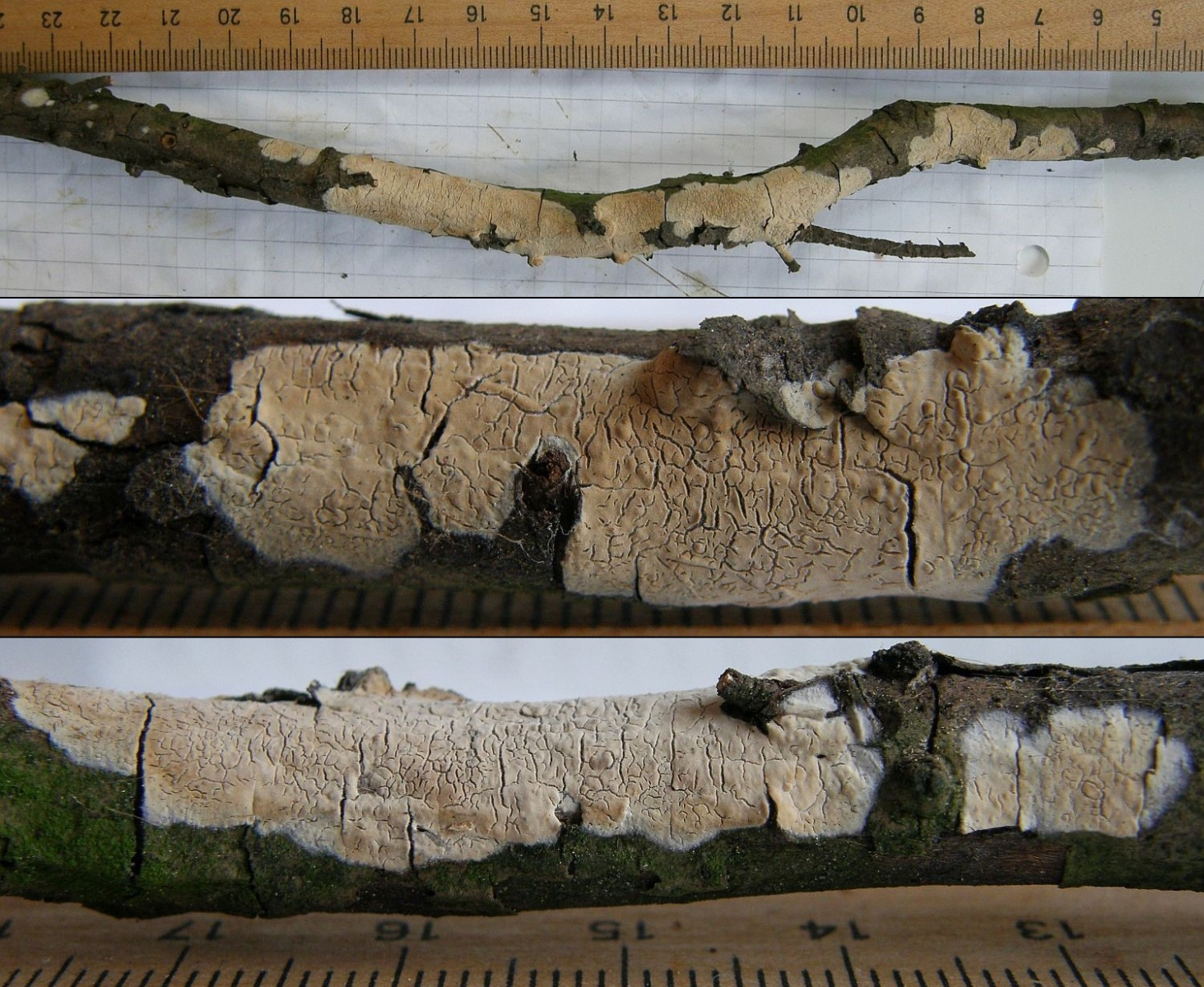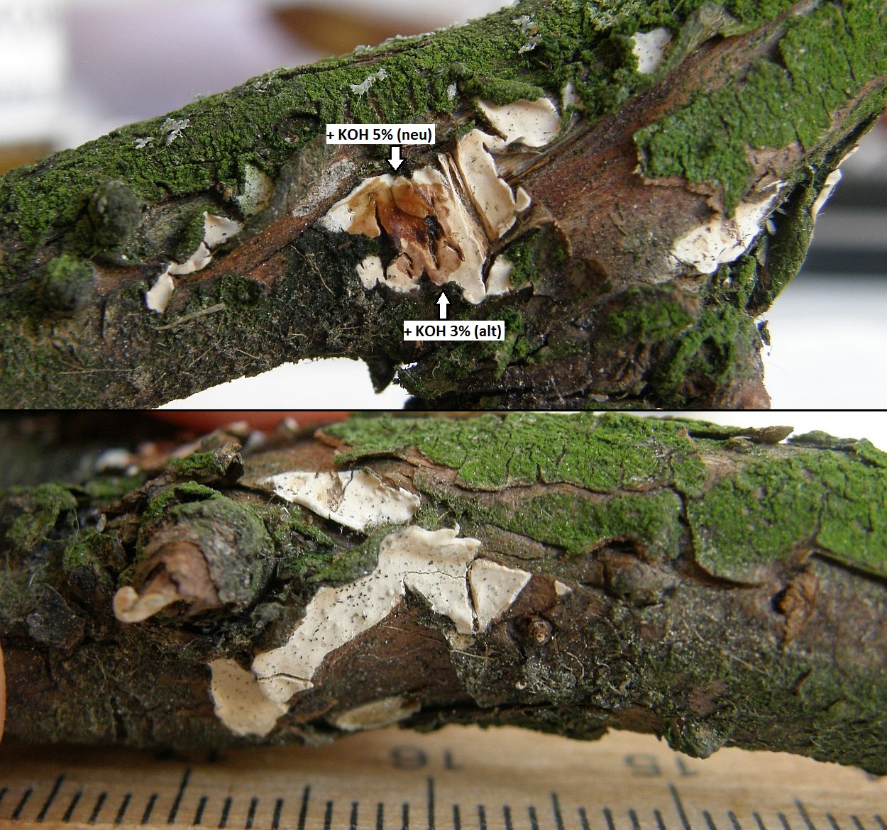 ich bin gerade dabei, alle Aufsammlungen einer Kartierungsexkursion nach Penzberg (Oberbayern) aufzuarbeiten. Dabei habe ich einen Corticioiden an Schwarzem Holler (Sambucus nigra) aufgesammelt. Es handelt sich beim Substrat um ein entrindetes Aststück, das unter einem Crataegus am Boden lag.