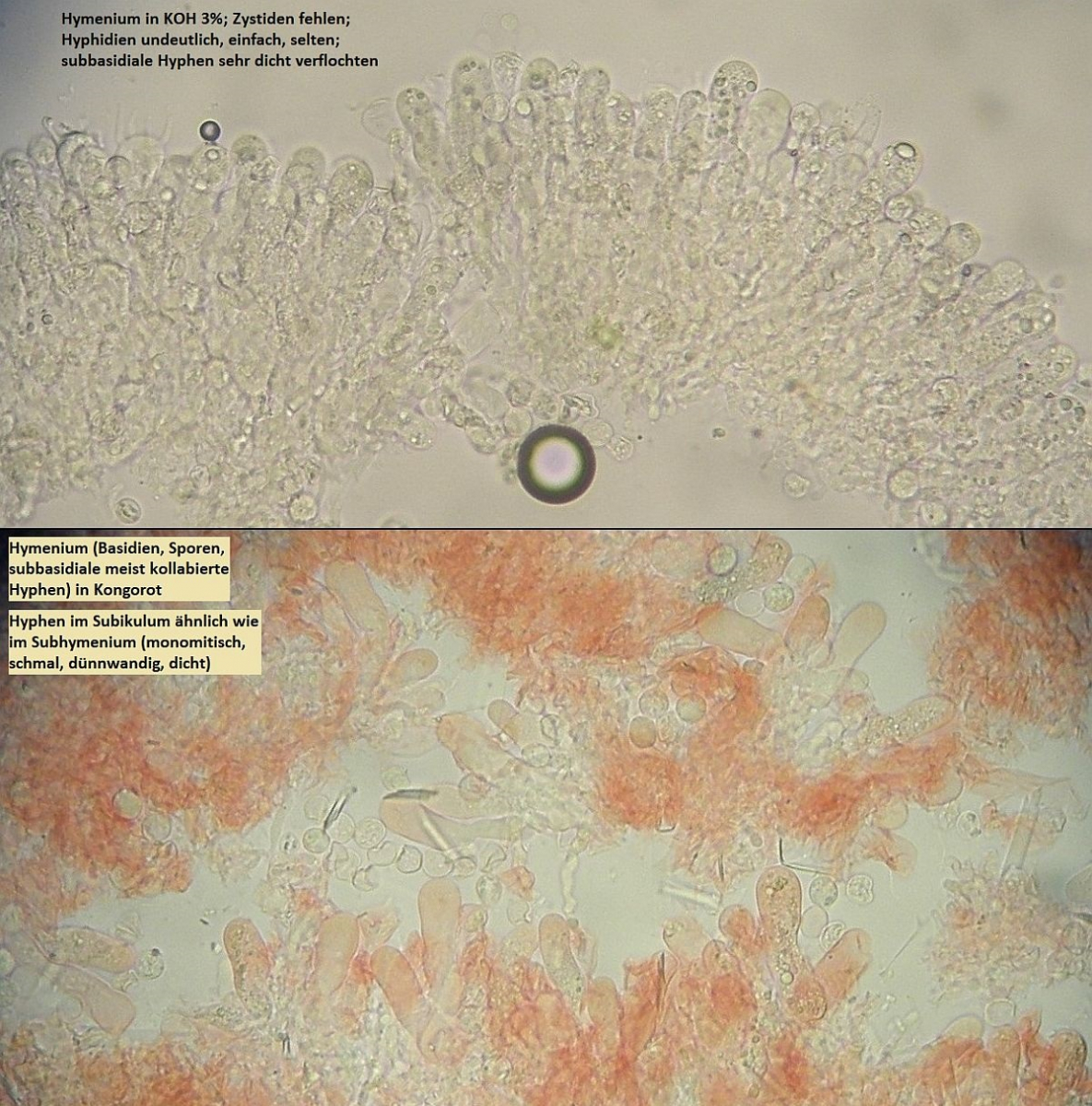 Im Mikroskop fallen die unzähligen Basidiolen auf. Nur wenige Basidien haben Sterigmen - und alle mit Sterigmen waren bereits kollabiert (ich habe den Corti anhand des Trockenbelegs untersucht, da ich es nicht geschafft hatte, alles frisch anzusehen). Auch mit KOH und/oder Kongo in Ammoniak ploppten die stergimentragenden Basidien nicht mehr auf. Man konnte aber erkennen, dass es viele zweisporige, aber auch viersporige Basidien gab.