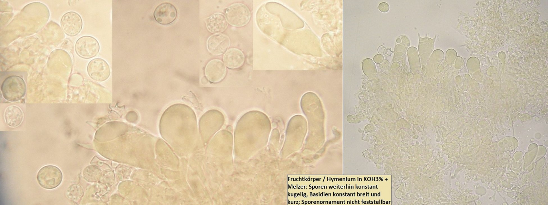 Im Mikroskop fallen die unzähligen Basidiolen auf. Nur wenige Basidien haben Sterigmen - und alle mit Sterigmen waren bereits kollabiert (ich habe den Corti anhand des Trockenbelegs untersucht, da ich es nicht geschafft hatte, alles frisch anzusehen). Auch mit KOH und/oder Kongo in Ammoniak ploppten die stergimentragenden Basidien nicht mehr auf. Man konnte aber erkennen, dass es viele zweisporige, aber auch viersporige Basidien gab.