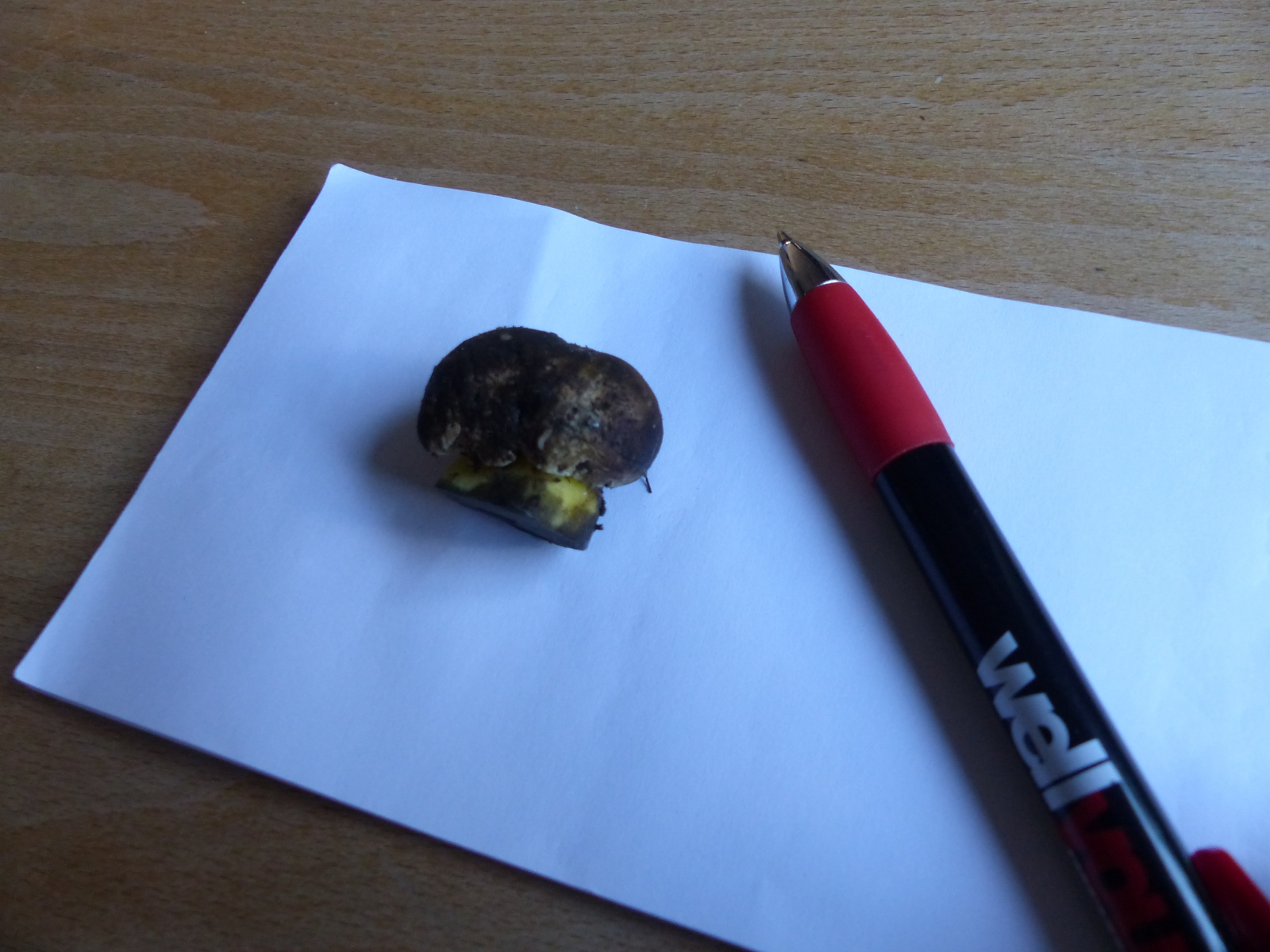 beim heutigen Ausflug auf einem Friedhof (wollte letzte Chance vor der Hitzewelle wahrnehmen) habe ich einen Röhrling gefunden. In der Umgebung standen diverse verschiedene Bäume. Für mich sah der eigentlich gleich wie ein wurzelnder Bitterröhrling aus. Gibts hier nicht täglich, aber habe ich schon mal gefunden. Weil sonst nicht viel zu finden war, hab ich den Röhrling mitgenommen zur genaueren Untersuchung. Da kam mir dann einiges komisch vor, Geschmacksprobe wollte partout nicht bitter sein, und Netz am Stiel hat auch gefehlt und Hut war zu dunkel. Dafür waren Röhren und Stiel knallig gelb. Könnte das ein Kornblumenröhrling sein? Wäre für mich ein Erstfund, freue mich hier eigentlich über jeden Rotfuß. Seht selbst (sorry für die schlechte Qualität, aber eigentlich hatte ich gar nicht vor, eine Anfrage zustellen).