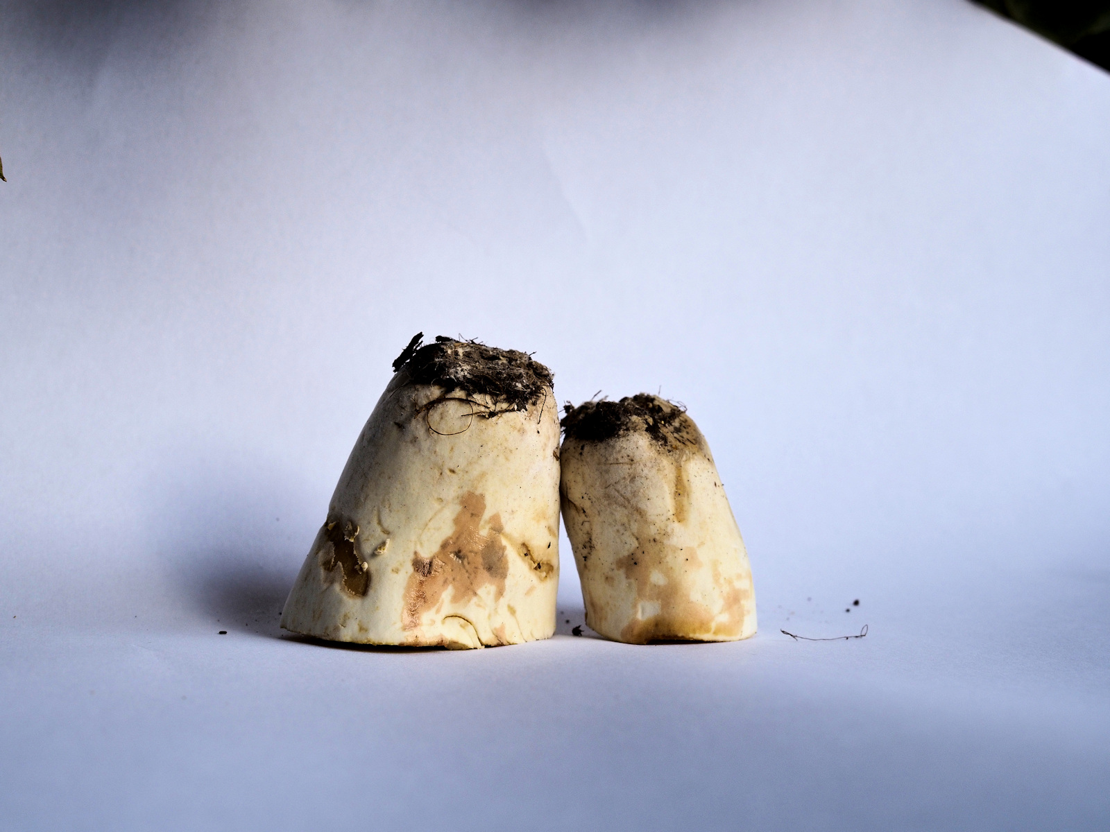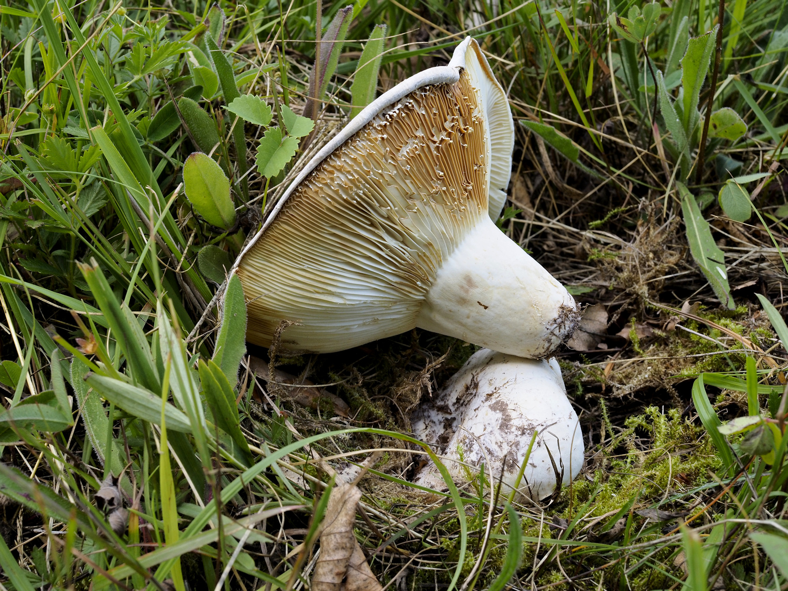 Bild 5, Lamellen auffällig stark bräunend fleckend, Stiel zur Basis verjüngt