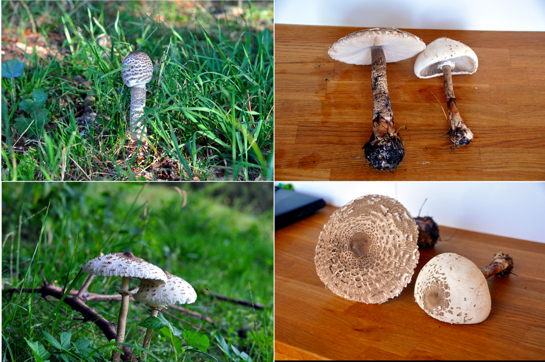 Die zwei Bilder rechts mit den zwei Pilzen nebeneinander sind links je der Parasol und rechts der unbekannte.