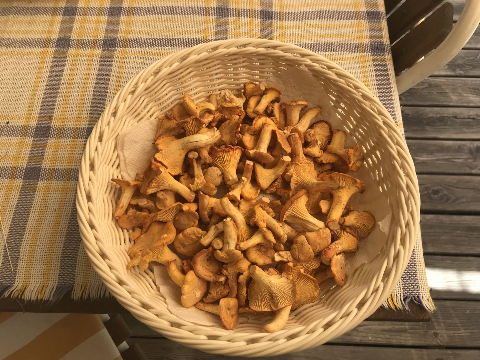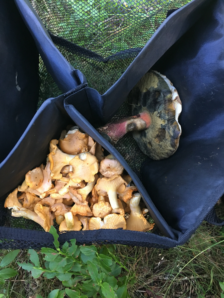 07‘00h - im Wald 07‘20h bei 24°C ( nun kamen knapp 3 h, angenehmer meist beschatteter Waldgang, einfach nur erholsam) ins Körbchen, kamen beste Pfifferlinge und 1 Rotfuß Röhrling! Bei der Abfahrt 10‘30h, waren es schon 28°C, in Lörrach dann 32°C!