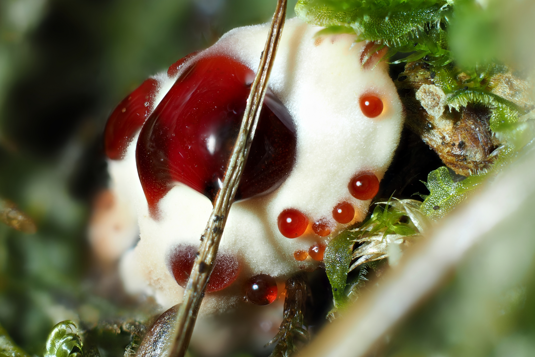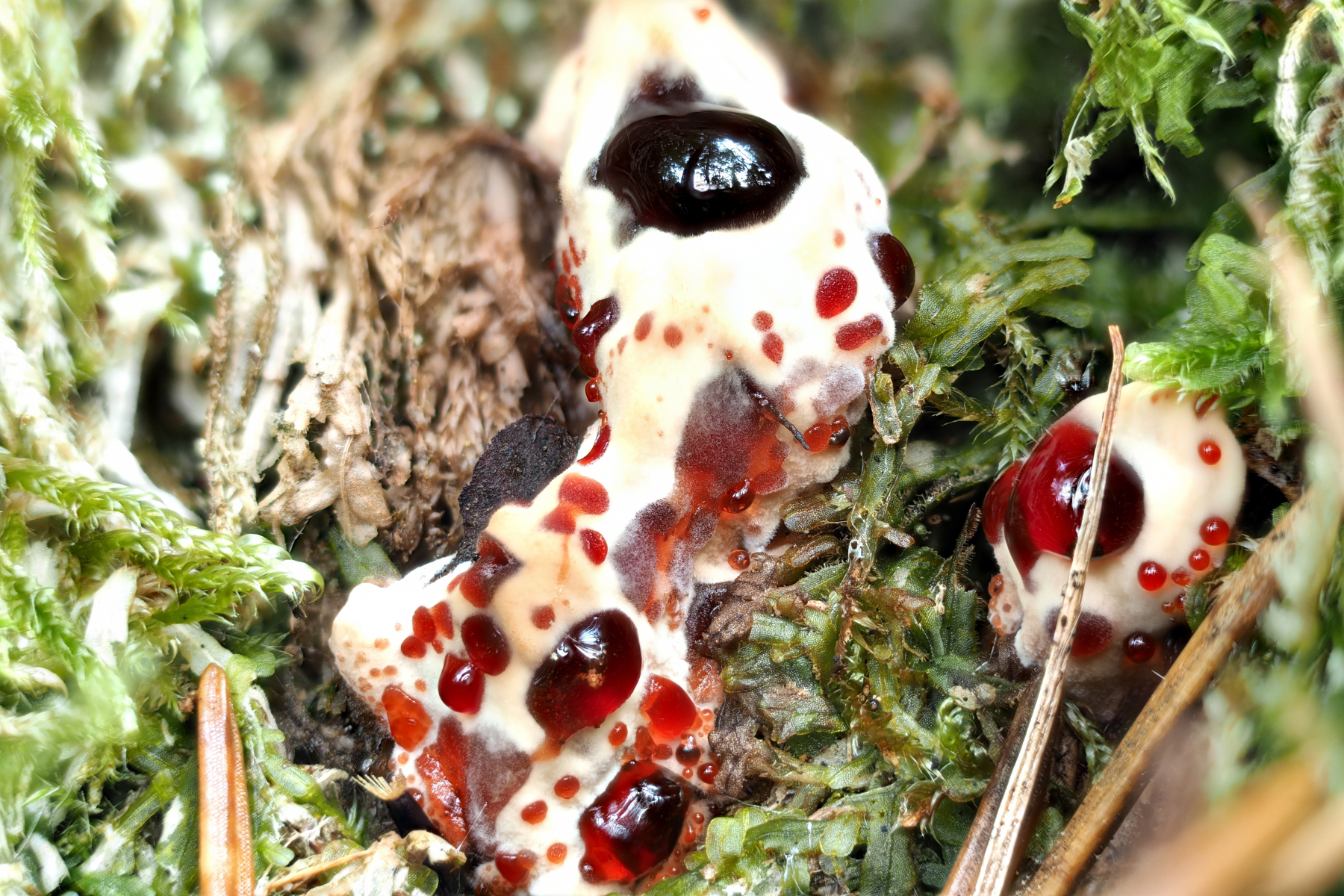 Von dem Korkstachling hätte ich aber gekostet. Meist schmeckt es dann sehr scharf, denn Hydnellum peckii ist viel häufiger als sein milder Doppelgänger.
