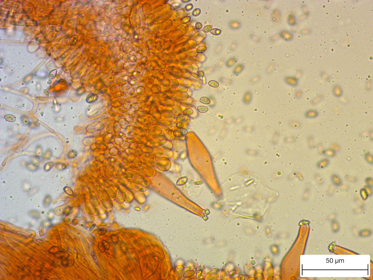 Pleurozystiden sind doch reichlich zu sehen? Die würden meiner ansicht nach schon passen, recht schlank lageniform, zahlreich, oft in grüppchen stehend...