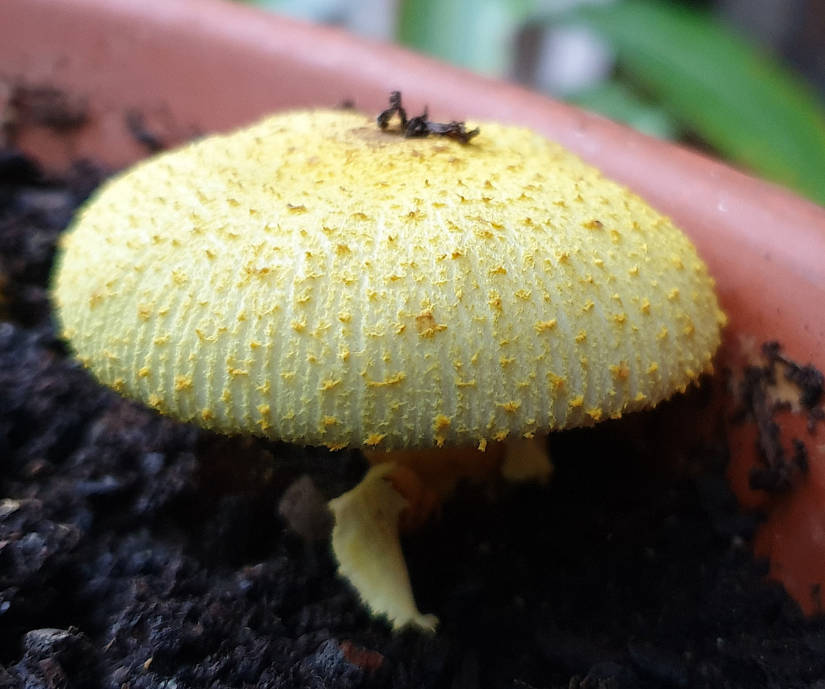 Beschreibung: Hut schuppig, zitronengelb, fast an Boviste erinnernd. Stiel glatt mit Maserung, etwas dunkler als der Hut. Hutdurchmesser des größten Exemplars bislang ca. 4 cm. Es scheinen insgesamt drei Pilze in dem Topf hochzukommen, und der größte hier bildet offenbar seitlich auch schon einen weiteren kleinen Fruchtkörper aus.