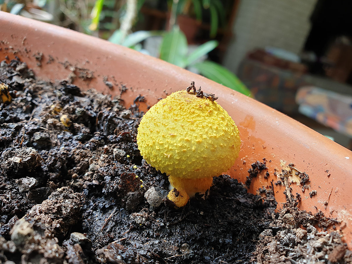 Beschreibung: Hut schuppig, zitronengelb, fast an Boviste erinnernd. Stiel glatt mit Maserung, etwas dunkler als der Hut. Hutdurchmesser des größten Exemplars bislang ca. 4 cm. Es scheinen insgesamt drei Pilze in dem Topf hochzukommen, und der größte hier bildet offenbar seitlich auch schon einen weiteren kleinen Fruchtkörper aus.