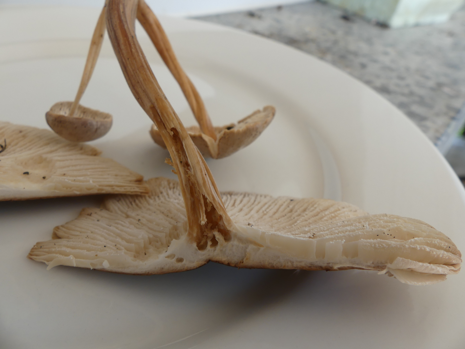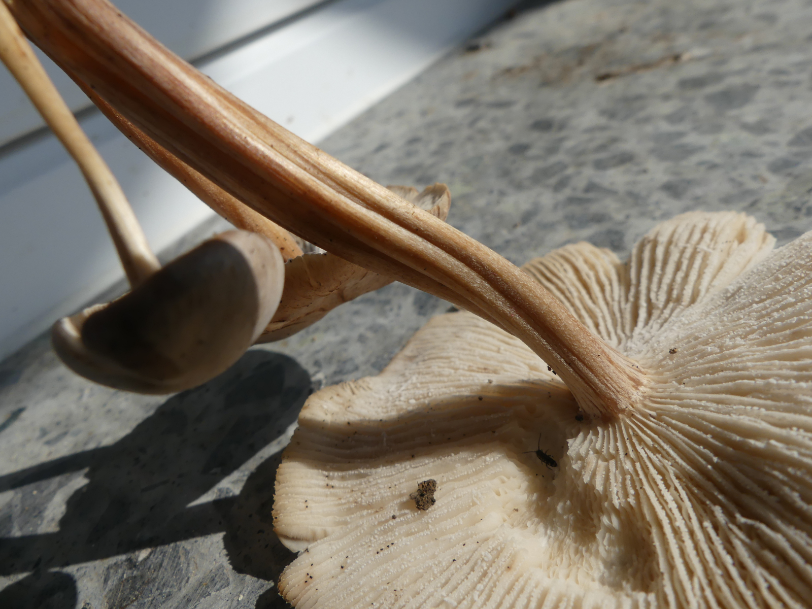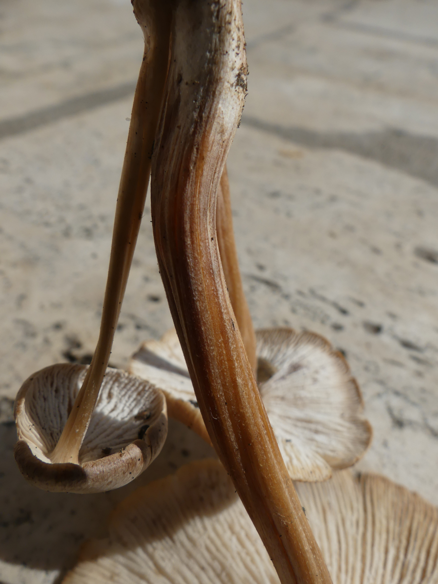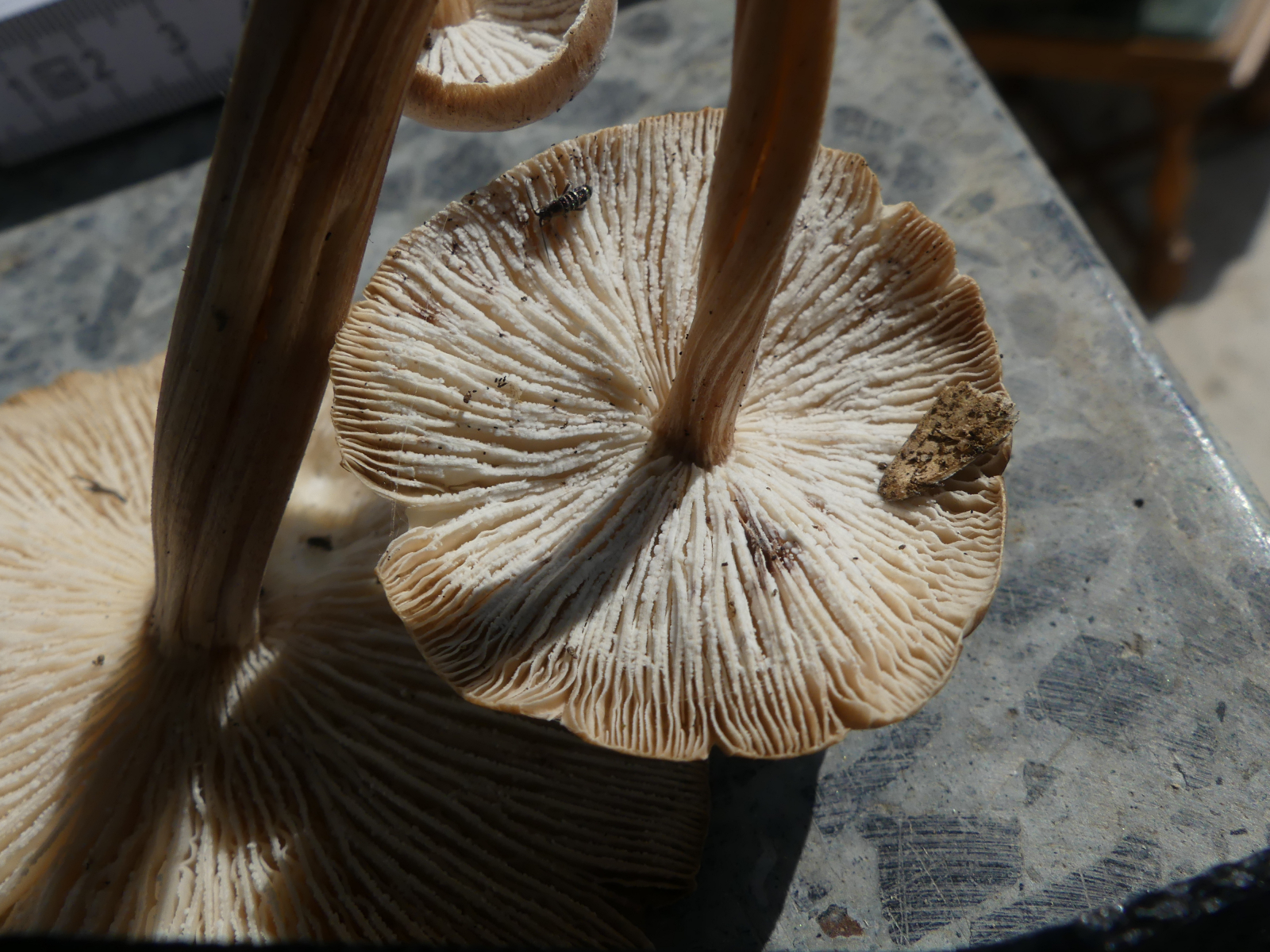 So sehen die drei Exemplare von unten aus. Sehr markant, wie ich finde. Die sehr stark ausgeprägte und verdrehte Längsrillung der Stiele zusammen mit der markanten Struktur der Lamellenschneiden finde ich bemerkenswert.