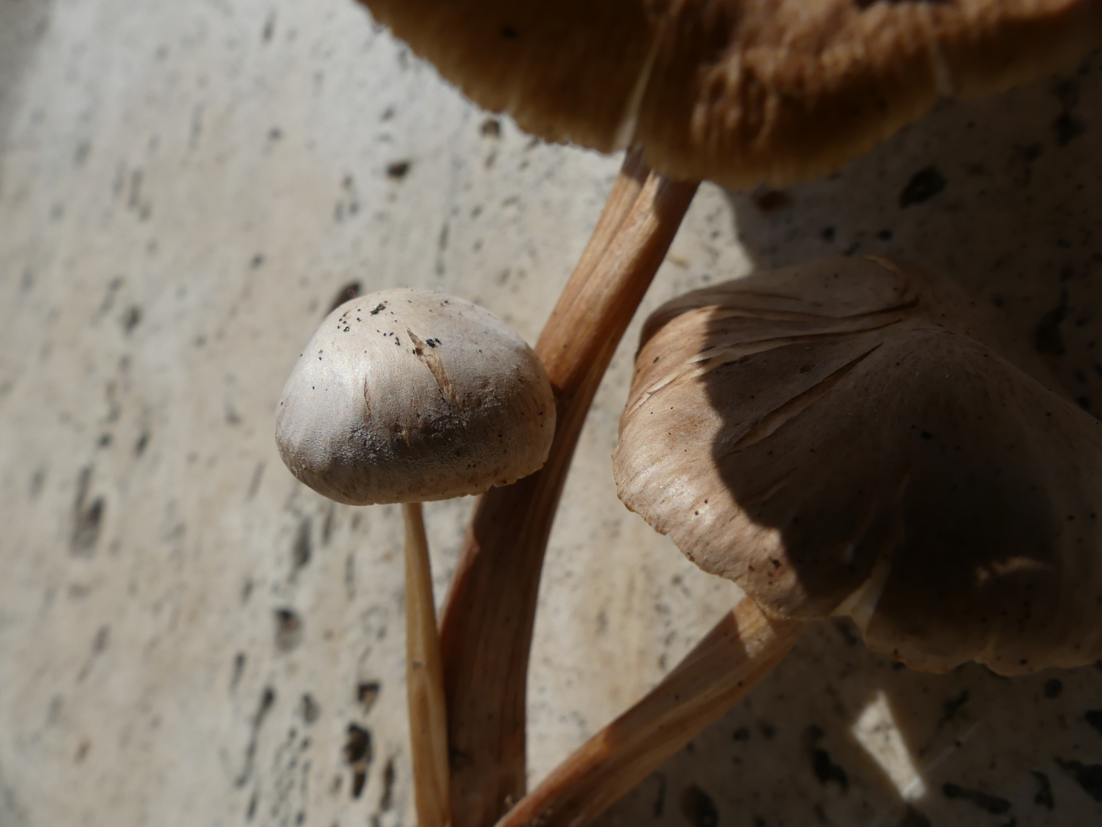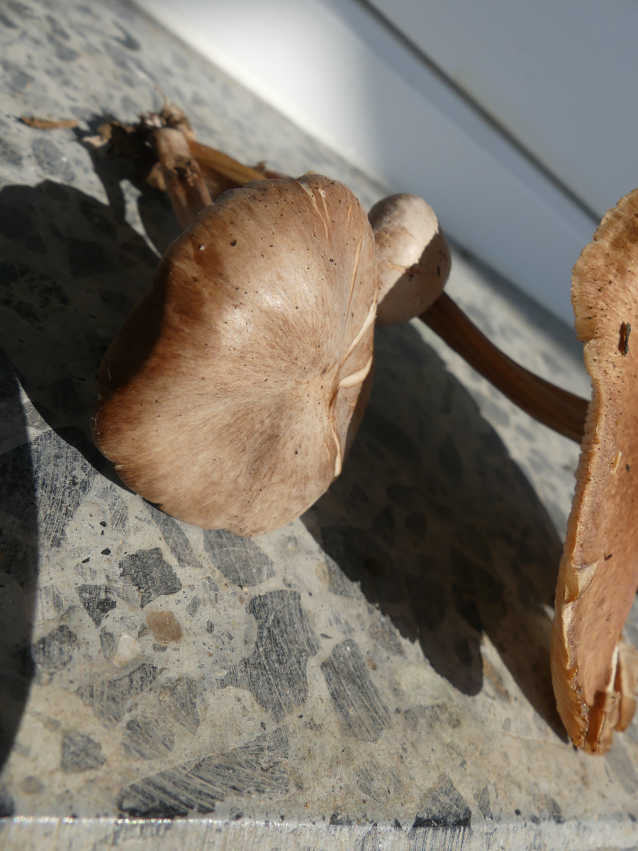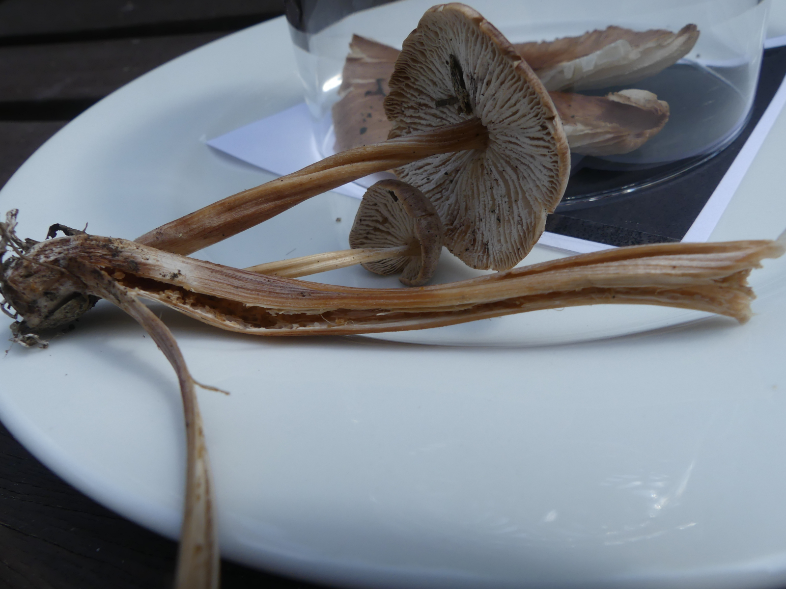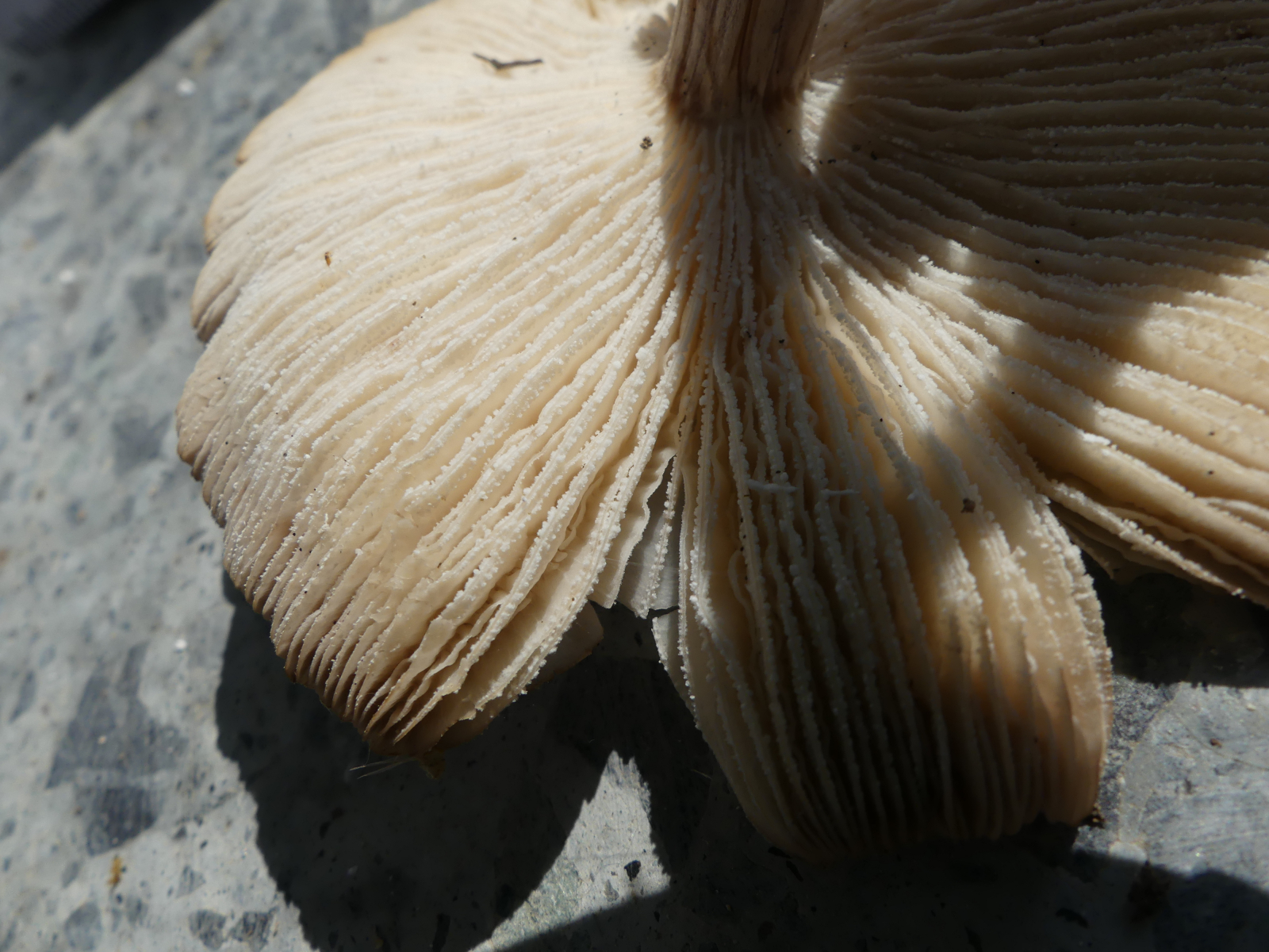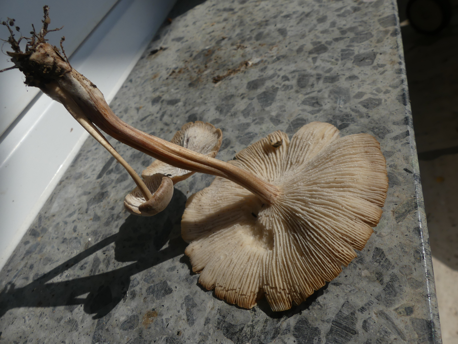 So sehen die drei Exemplare von unten aus. Sehr markant, wie ich finde. Die sehr stark ausgeprägte und verdrehte Längsrillung der Stiele zusammen mit der markanten Struktur der Lamellenschneiden finde ich bemerkenswert.