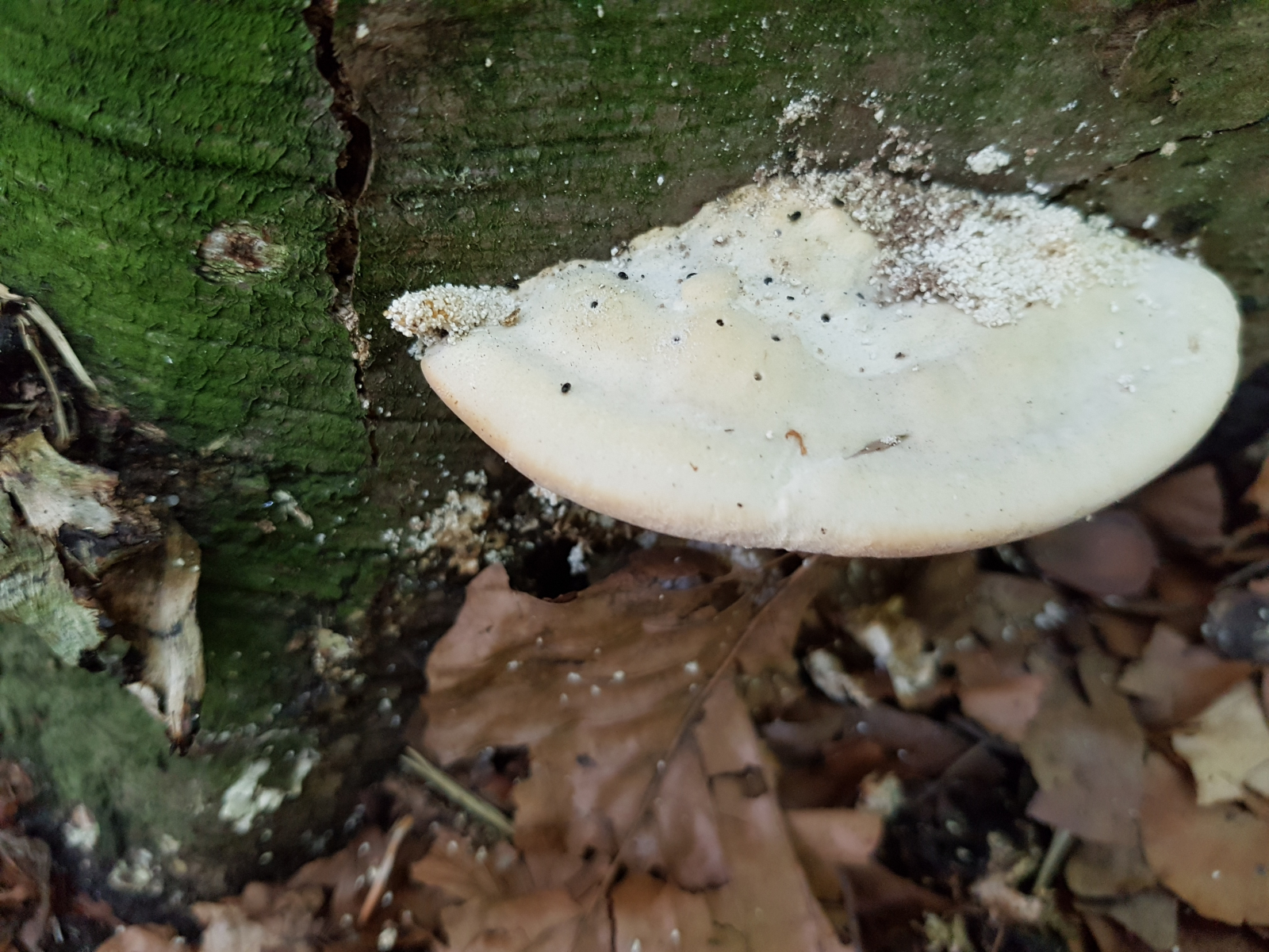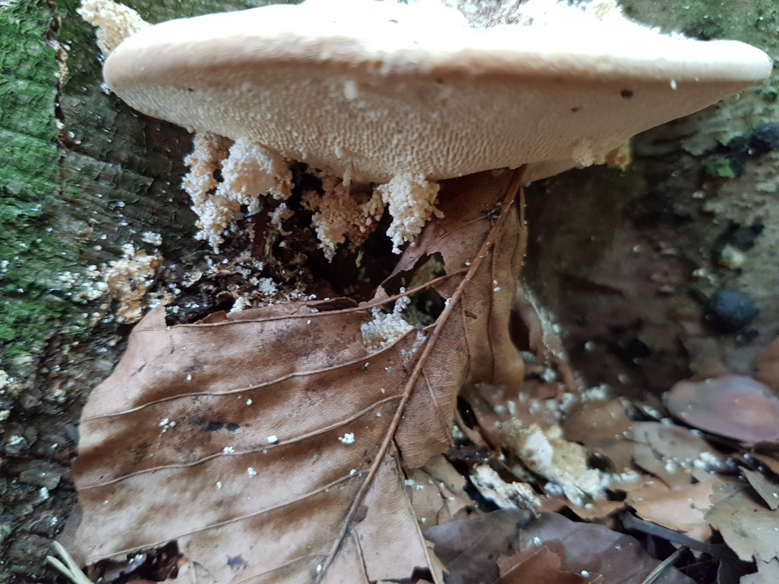 dein erster Pilz dürfte eine Buckeltramete - Trametes gibbosa sein, erkennbar an den länglichen Poren.