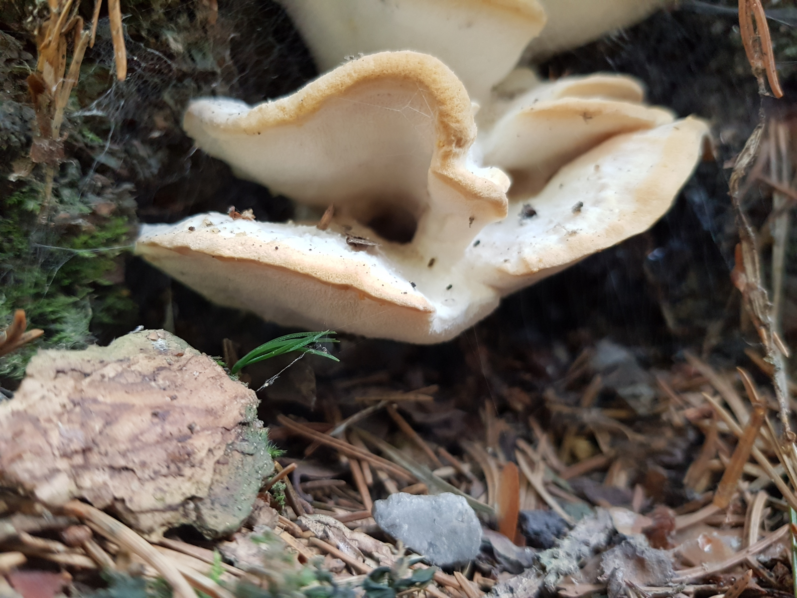 Die zweite ist mit große Wahrscheinlichkeit junge Climacocystis borealis , an Fichtenstamm (an Bild ist zu sehen viele Fichtennadel) , Rand von Pilz hat etwas leichte gelb-orang Farbe , typisch für junge Frk. .