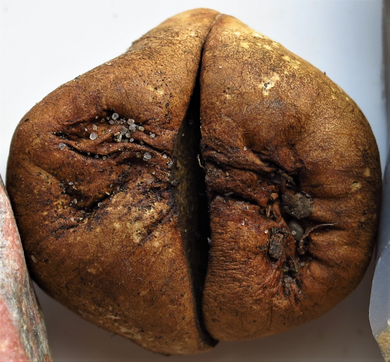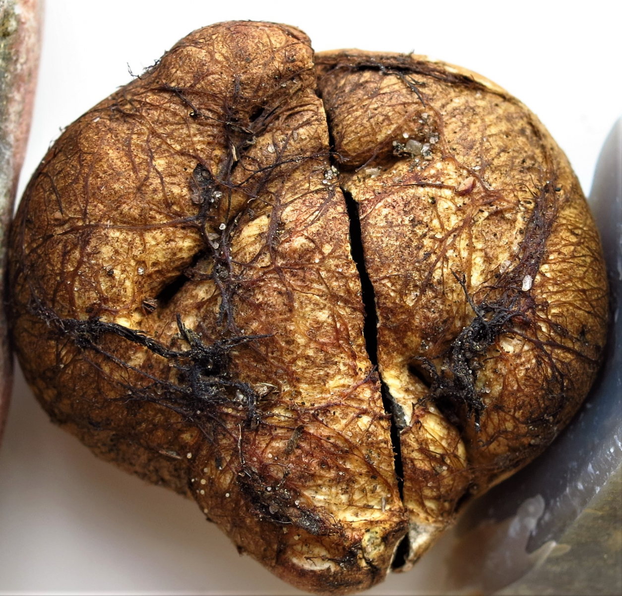 Einiges kann ich mir aber nicht erklären. So finden sich auf seiner Oberfläche keinerlei „Warzen“ oder auch nur Spuren davon. Das Fruchtfleisch ist nicht grau sondern grünlichbraun und stinkt ganz fürchterlich. Größe etwa 4cm.