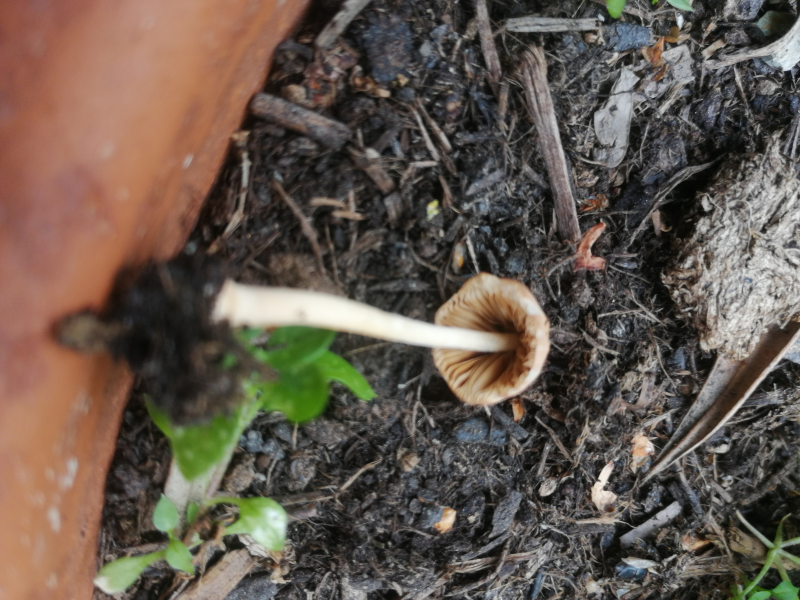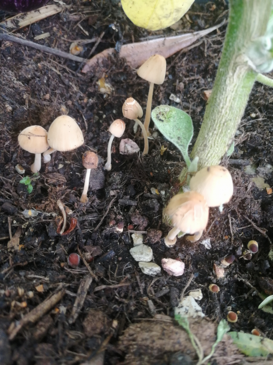 Anfangen möchte ich heute mit einem Pilz, der in einem meiner Auberginentöpfe wächst. er ist sicher nicht essbar, wohl aber auch nicht giftig, wenn ich mich nicht täusche. Aber ich werde nicht ganz schlau aus ihm: ein Düngerling? Ich frage auch, weil, falls er doch giftig ist, ich ihn vielleicht besser entfernen sollte, falls die Hühner drüber kommen? Die beiden Fotos sind leider nicht sehr gut, der Pilz ist nicht so hell, wie er auf dem Foto erscheint, es ist ein helles Braun. Beim zweiten ist der Pilz schon etwas trocken. Vielleicht erkennt ihn aber doch jemand. Falls nicht, versuche ich, morgen nochmal zu fotografieren, es kommen ja noch massenweise nach, wie man an den kleinen braunen Köpfchen erkennen kann.