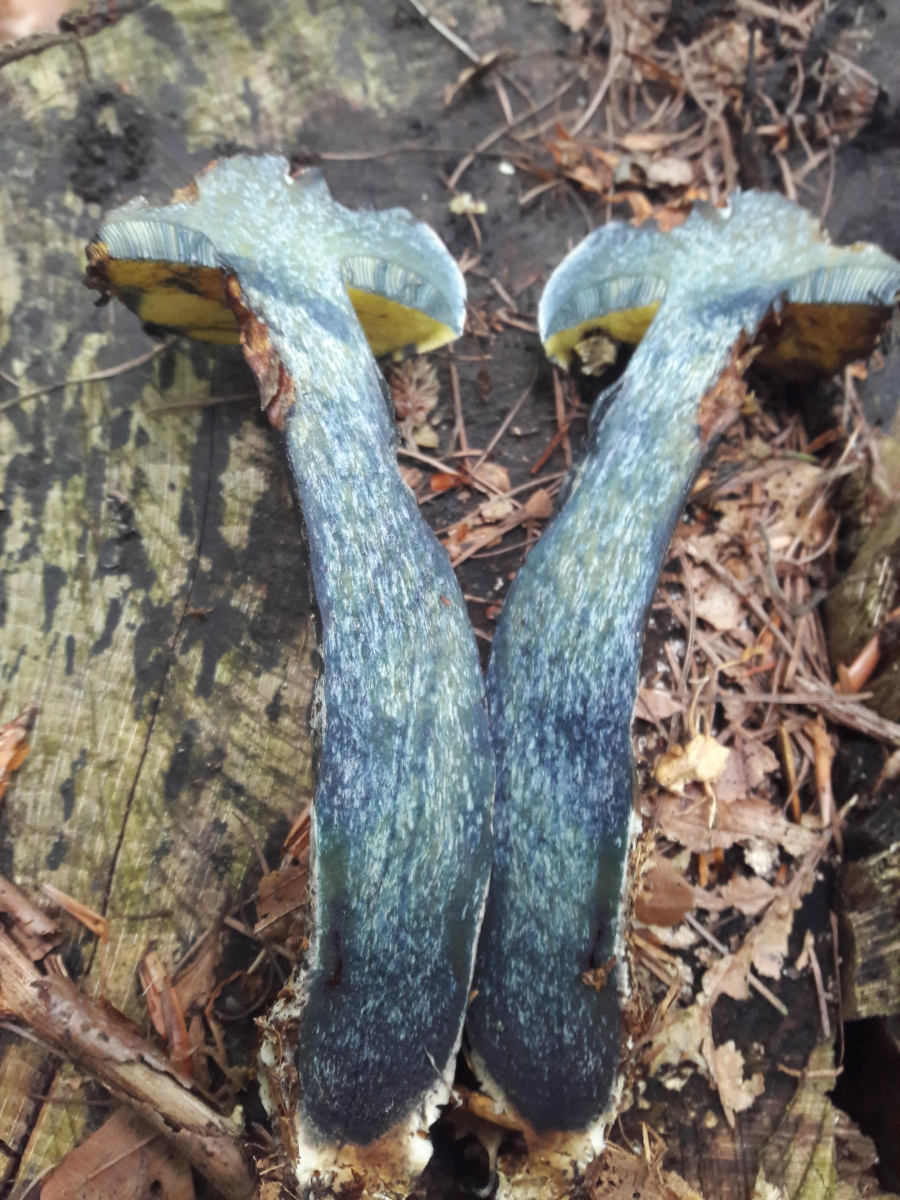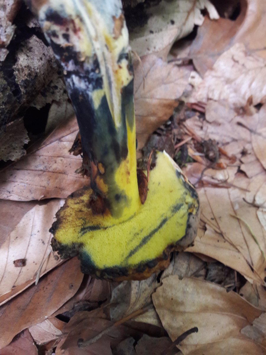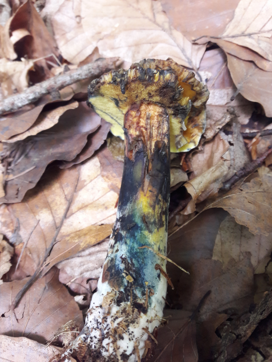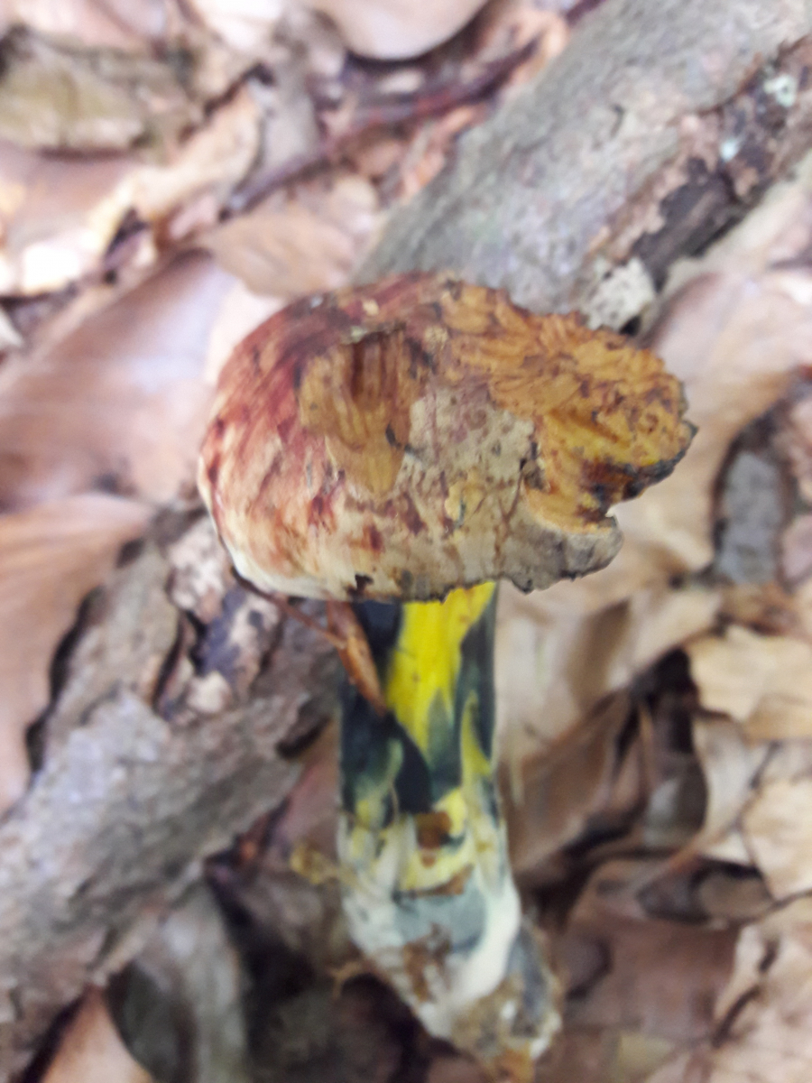 4. Als ich den entnahm, sah der schon so mitgenommen und regenbogenfarben aus. Erst hatte ich keine wirkliche Idee, aber dann kam ich zu dem Schluss, dass es der Schwarzblauende Röhrling ( Cyanoboletus pulverulentus) sein muss. Mit so langem Stiel hatte ich den noch nicht gesehen. Aber er musste sich ja auch tapfer durch die dicke Buchenlaubschicht kämpfen.
