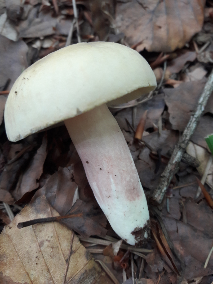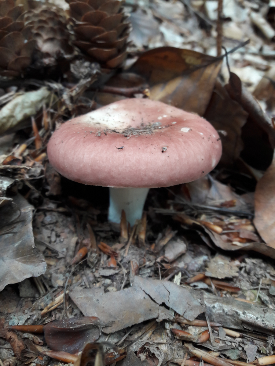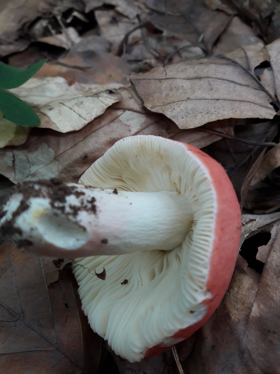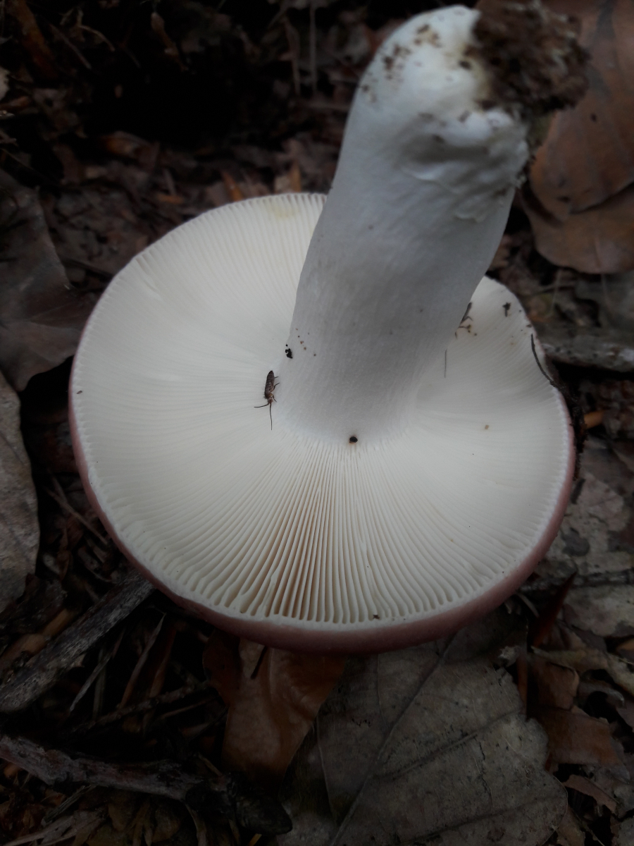 6. Hier vermute ich den Fleischroten Speisetäubling (Russla vesca). Mir erschien es so, als reichte die Huthaut nicht ganz über die Lamellen