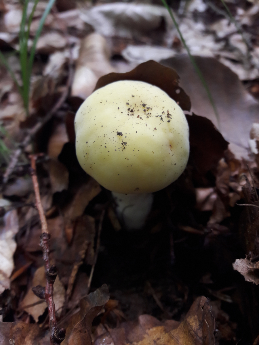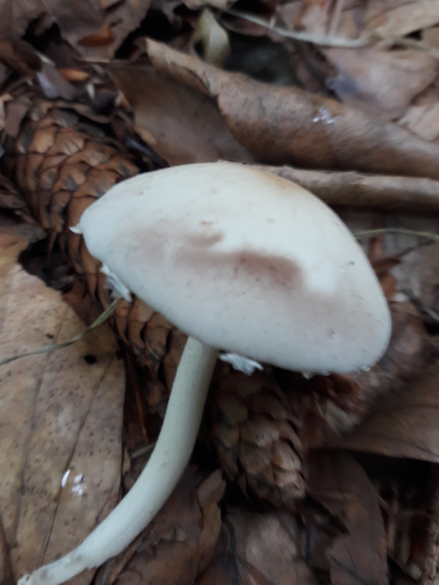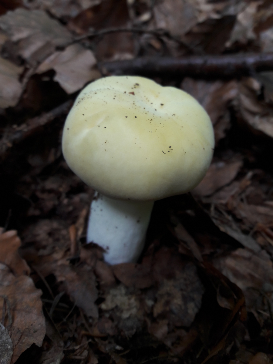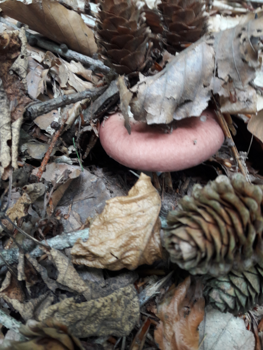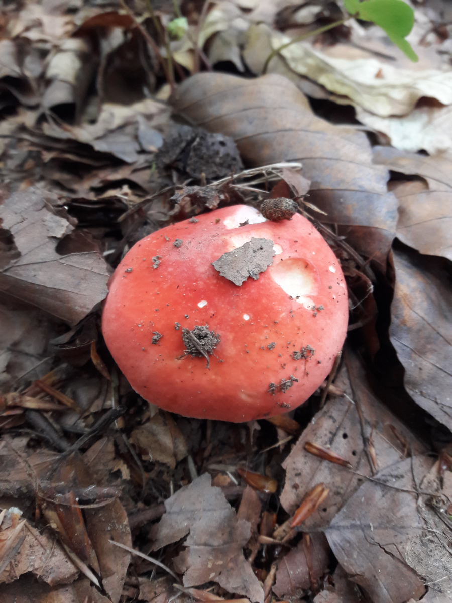 6. Hier vermute ich den Fleischroten Speisetäubling (Russla vesca). Mir erschien es so, als reichte die Huthaut nicht ganz über die Lamellen