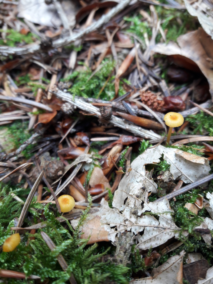 13. Bei diesem stecknadelgroßen Pilz in knallorange vermute ich den Orangeroten Heftelnabeling (Rickenella fibula)