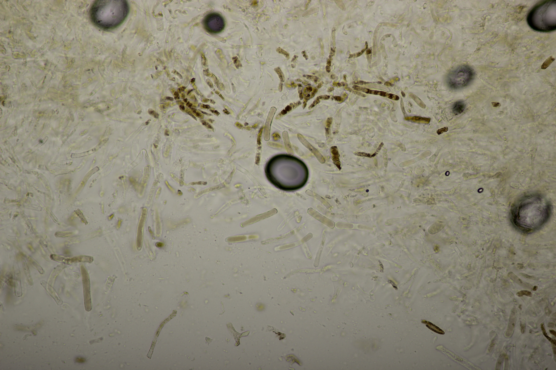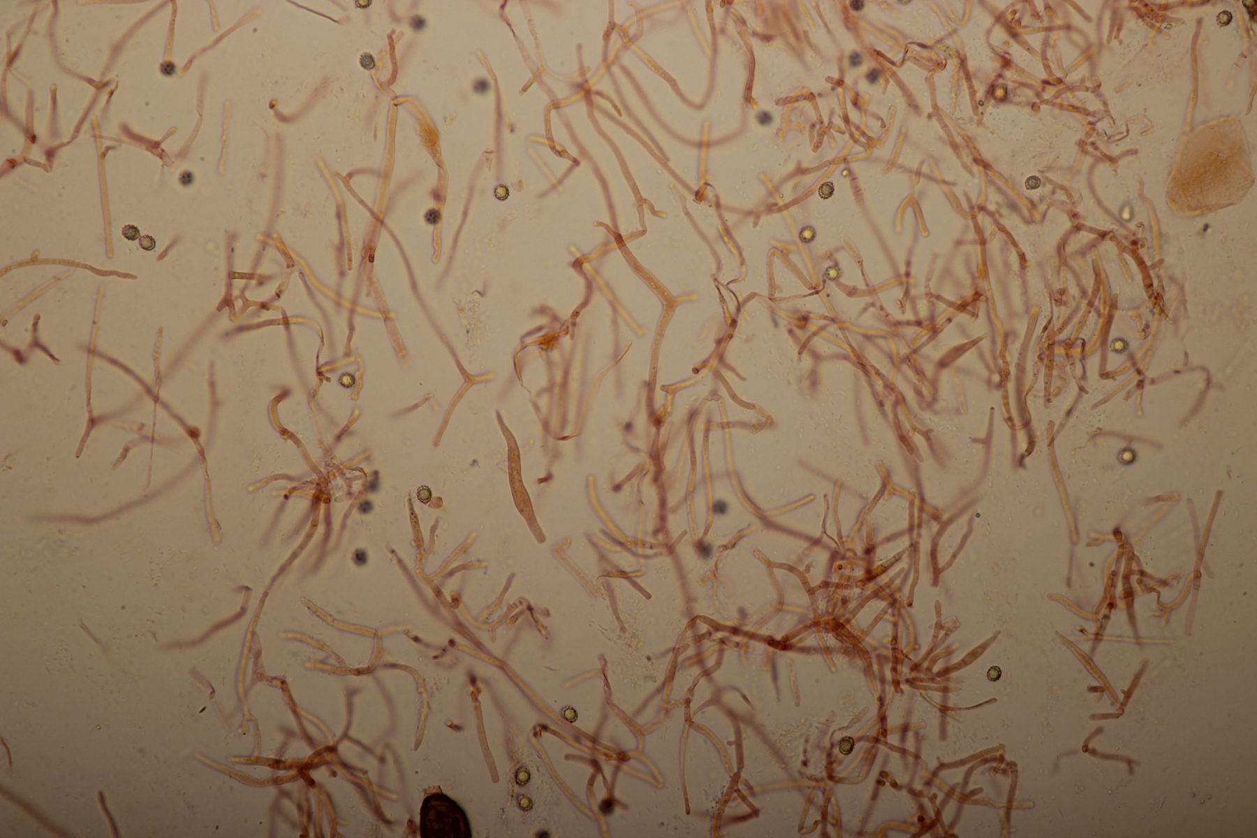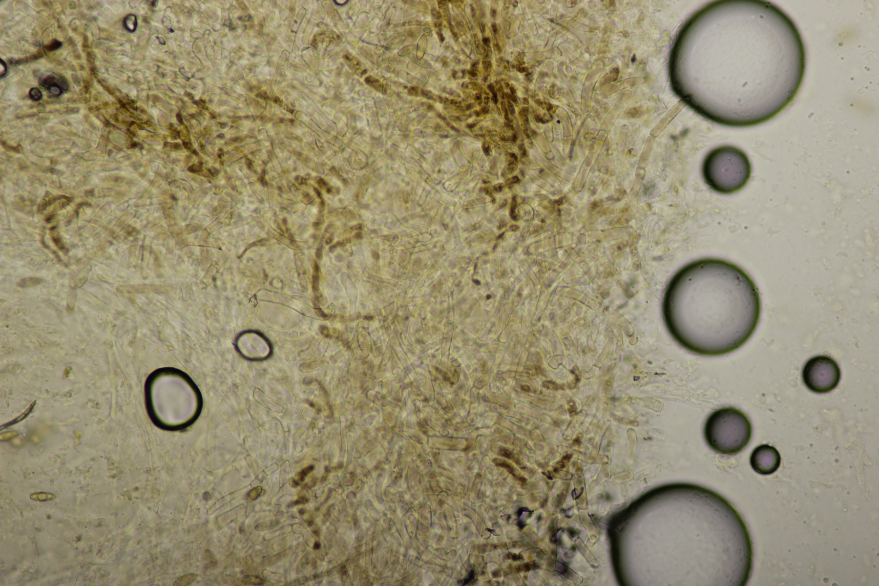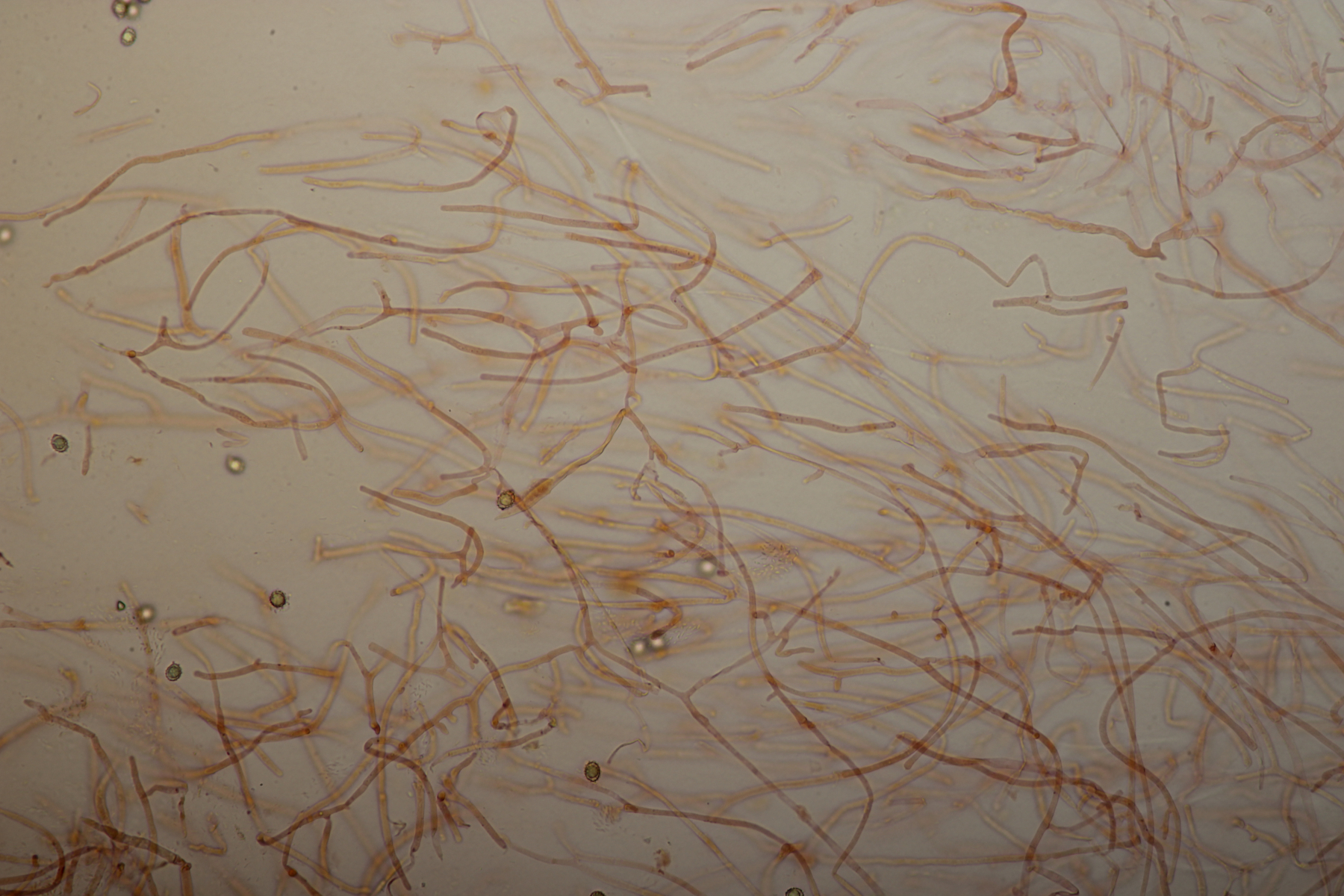 Huthaut. Die braun-inkrustierten Hyphen zusammen mit den länglichen, hellbraunen Zellen scheinen charakteristisch für die Art zu sein.