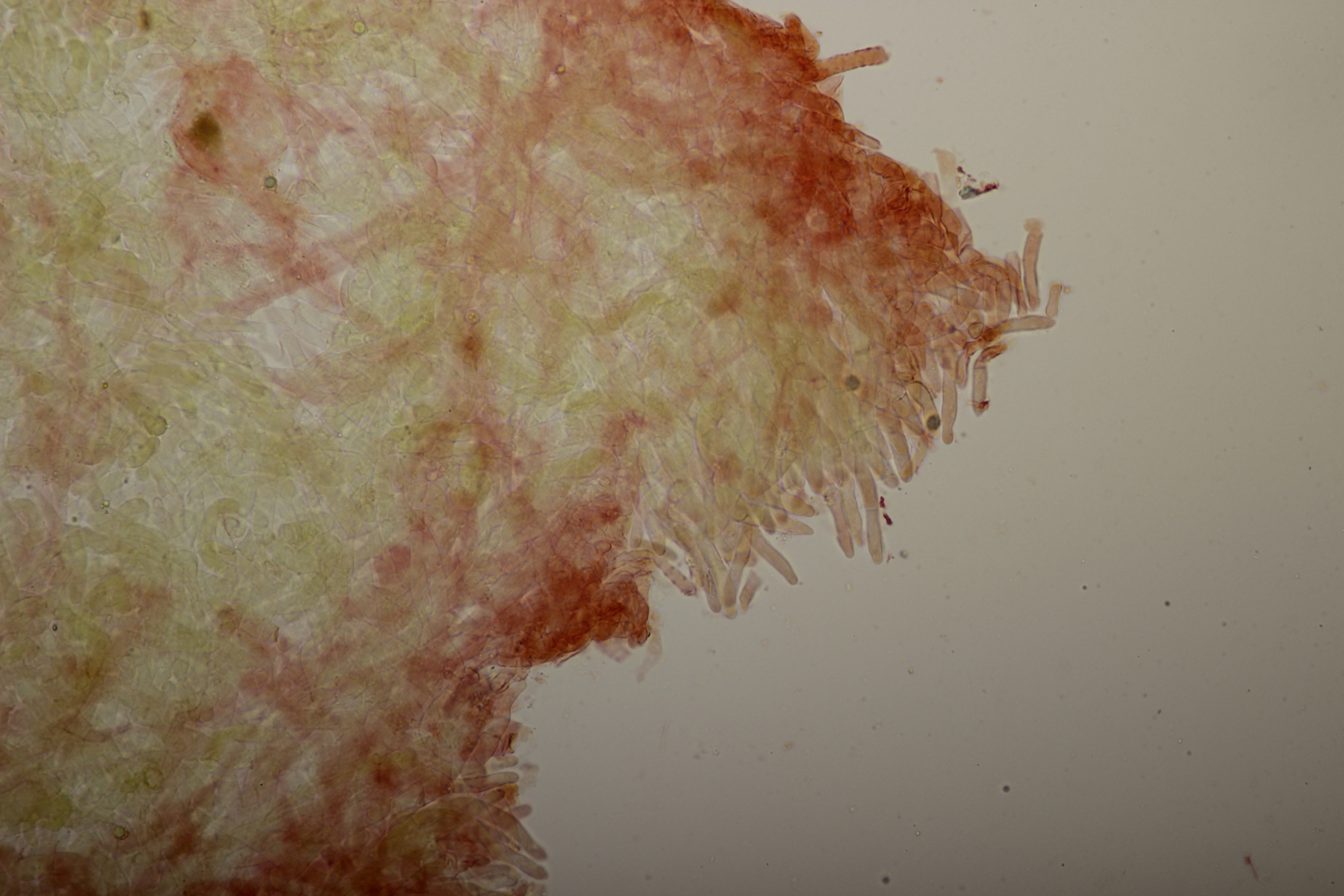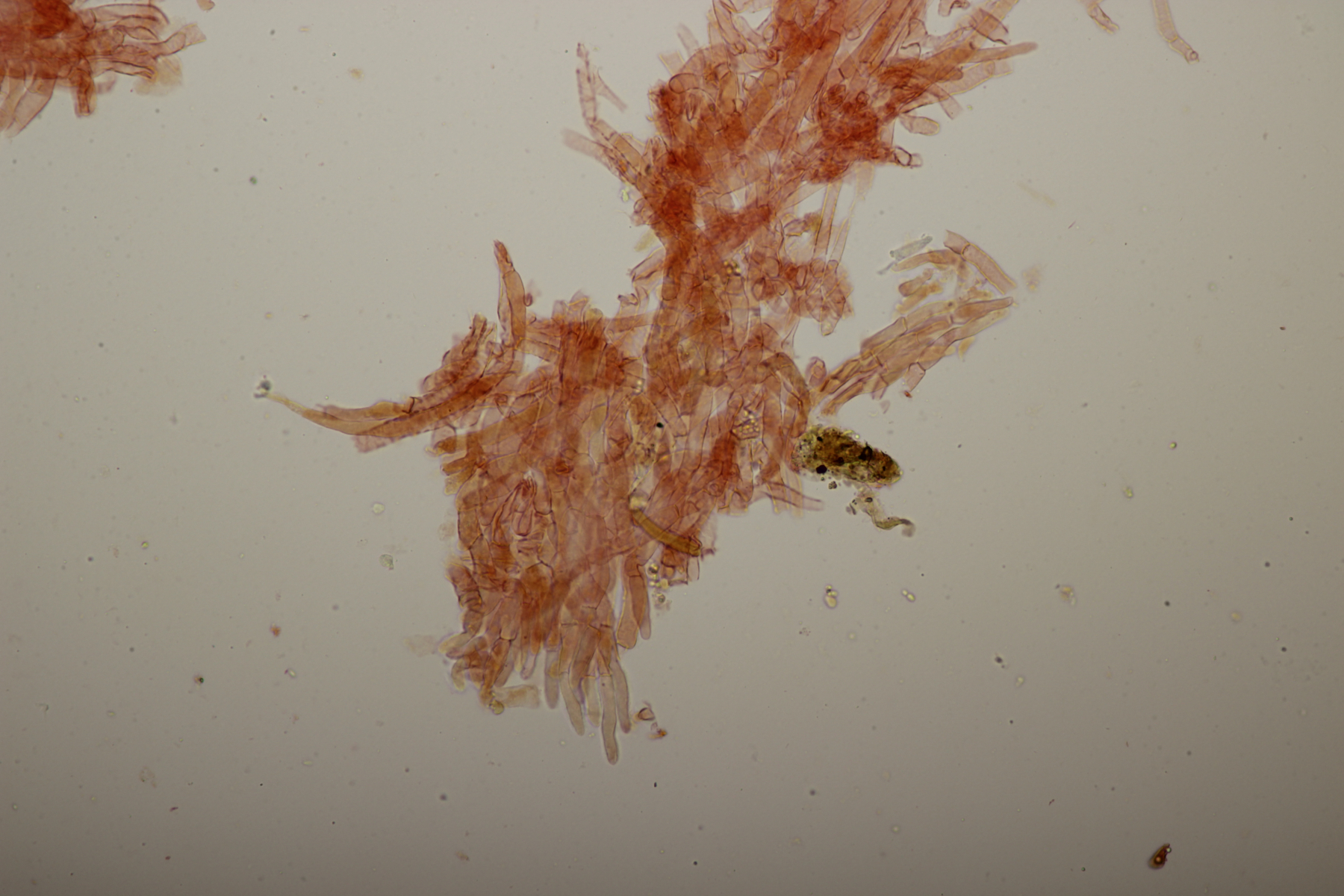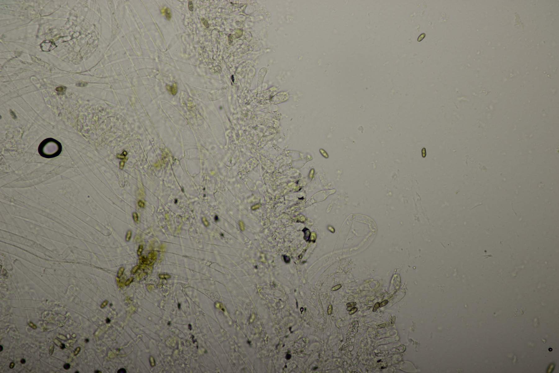 Huthaut. Die braun-inkrustierten Hyphen zusammen mit den länglichen, hellbraunen Zellen scheinen charakteristisch für die Art zu sein.