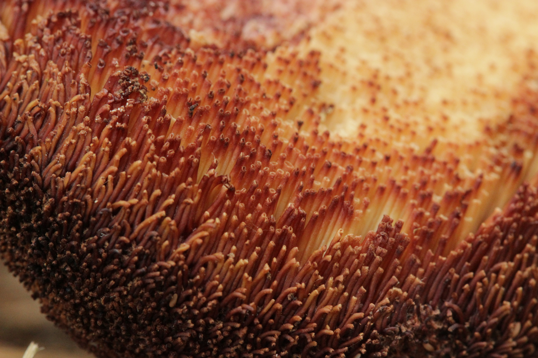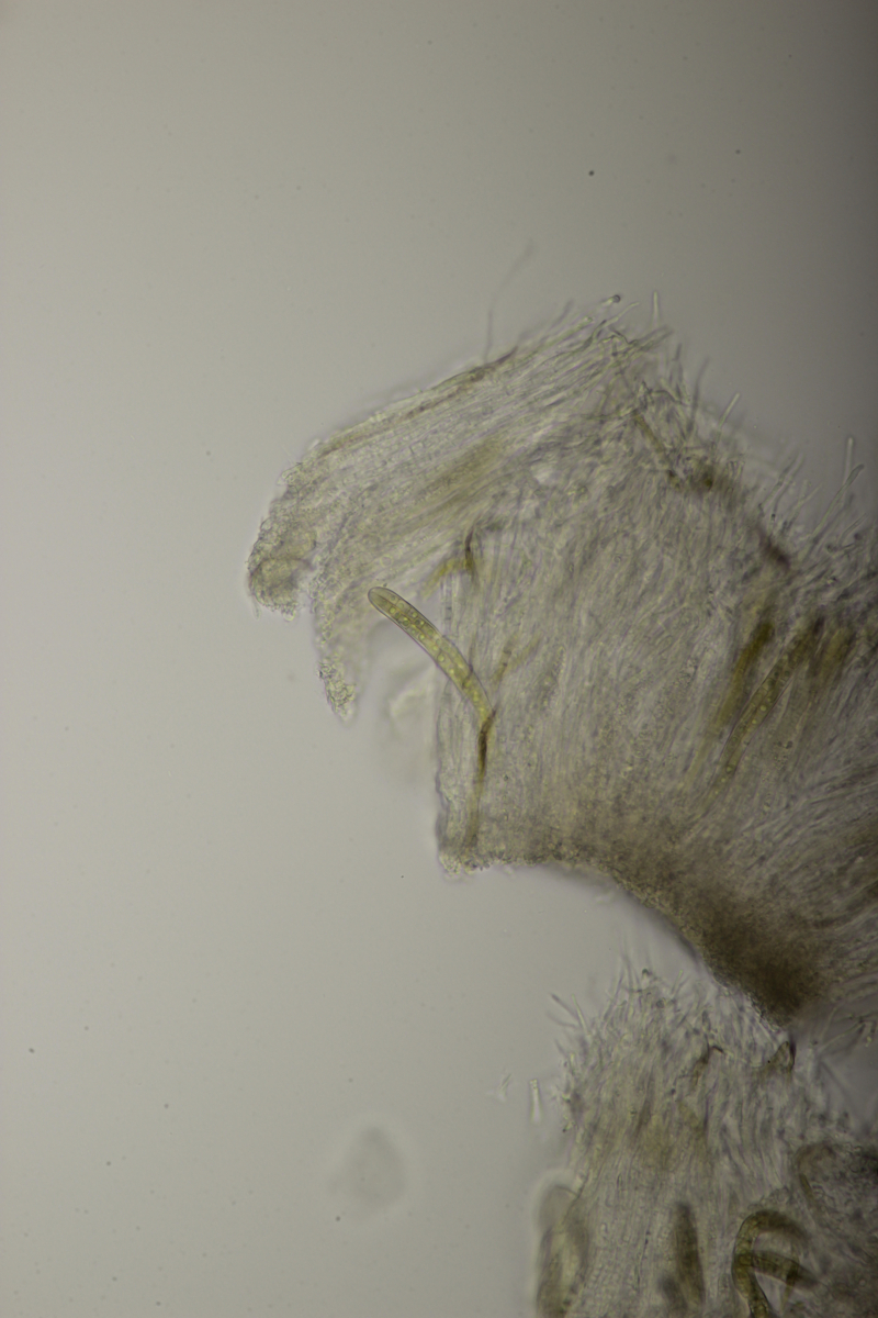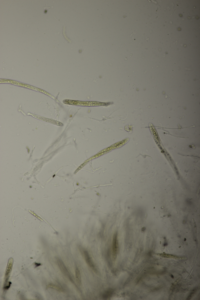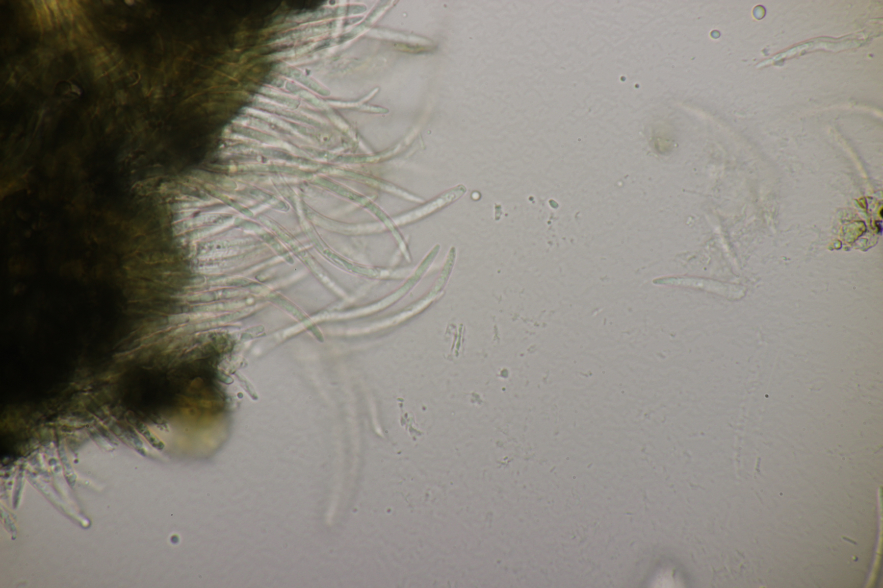 Huthaut. Die braun-inkrustierten Hyphen zusammen mit den länglichen, hellbraunen Zellen scheinen charakteristisch für die Art zu sein.