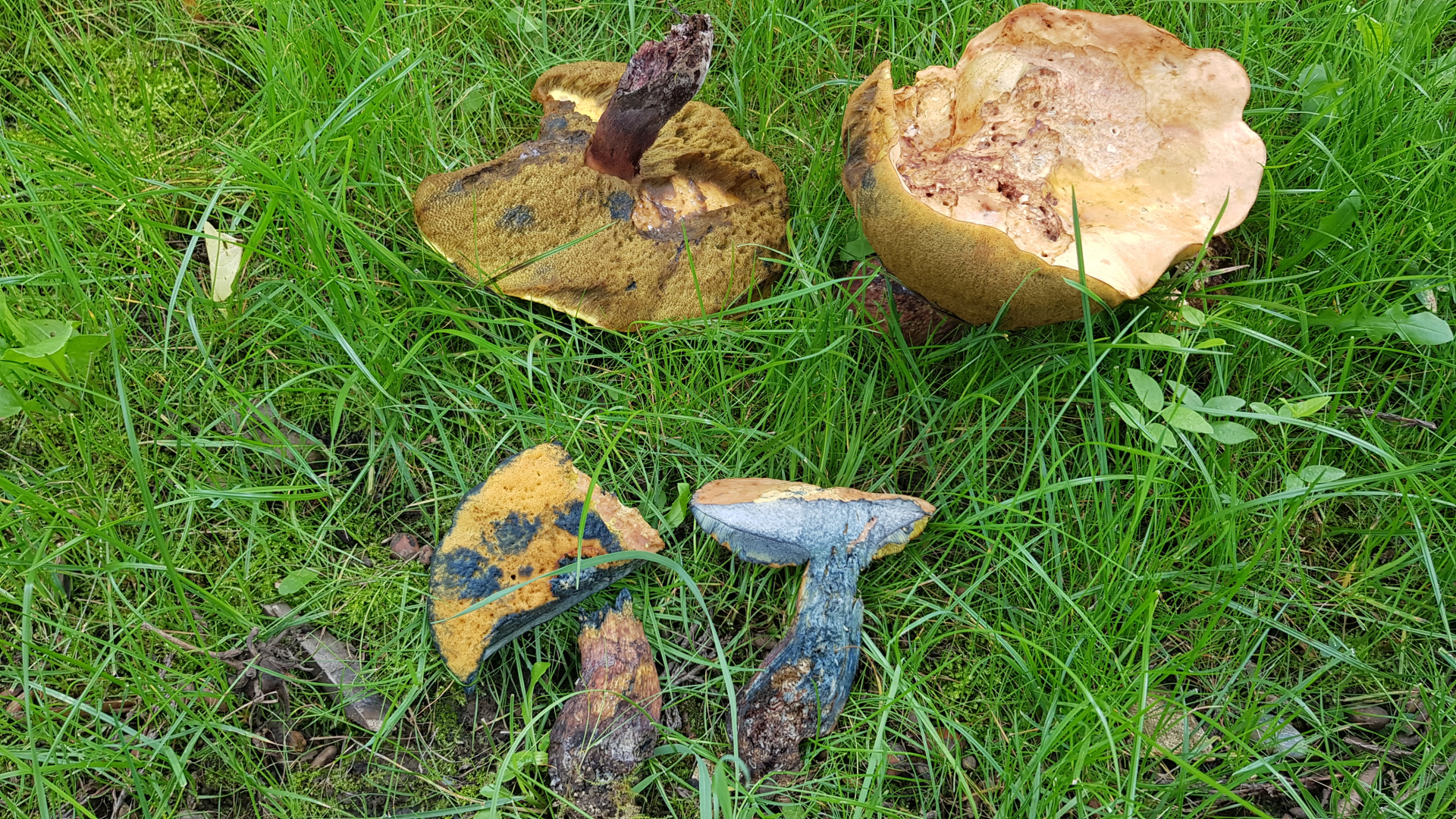 gerade ging ich in Ehingen einer Straße entlang und erspähte unter dem Betonbegleitgrün ein Massenvorkommen von diesen Röhrlingen: