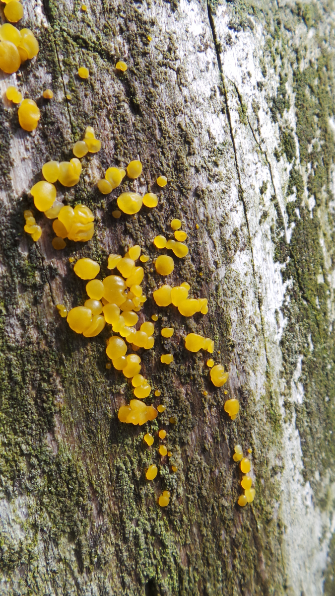 Zu meiner außerordentlichen Verdatterung fand ich an den ortsüblichen im Hafenbereich eingerammten Rundhölzern tatsächlich offensichtlich salzwassertolerante Gallertpilze, orange und gelb:
