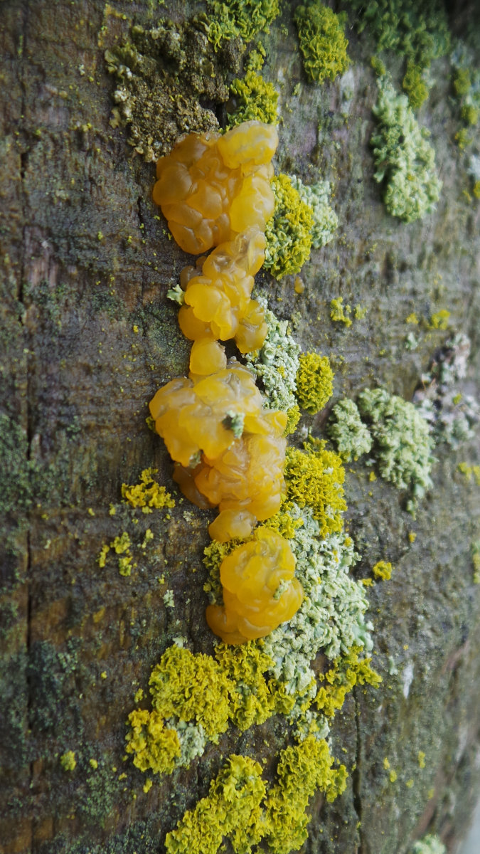 Zu meiner außerordentlichen Verdatterung fand ich an den ortsüblichen im Hafenbereich eingerammten Rundhölzern tatsächlich offensichtlich salzwassertolerante Gallertpilze, orange und gelb: