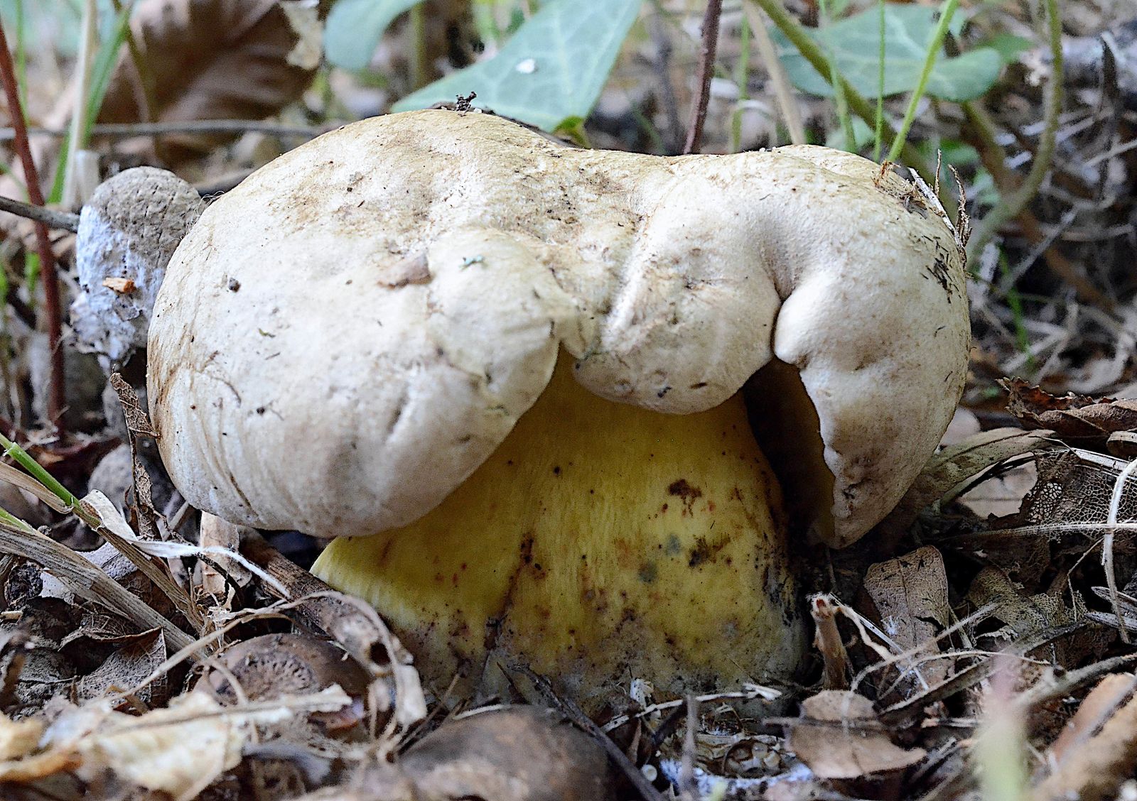 Und, zur Überraschung auf diesem Terrain, der WuBi (=Wurzelnder Bitterröhrling). Neuer Fundort in Offenbach.