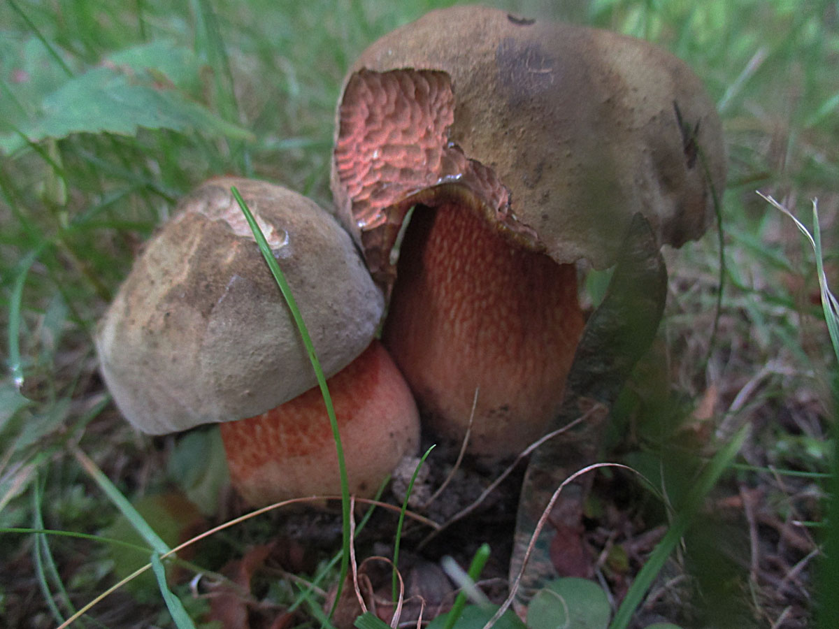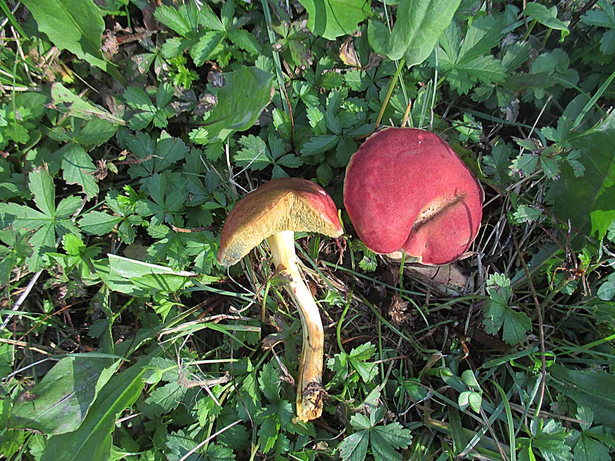 Nicht weit davon entfernt ihre Verwandten, die Flockenhexen, Flockenstieliger Hexenröhrling (Neoboletus erythropus).