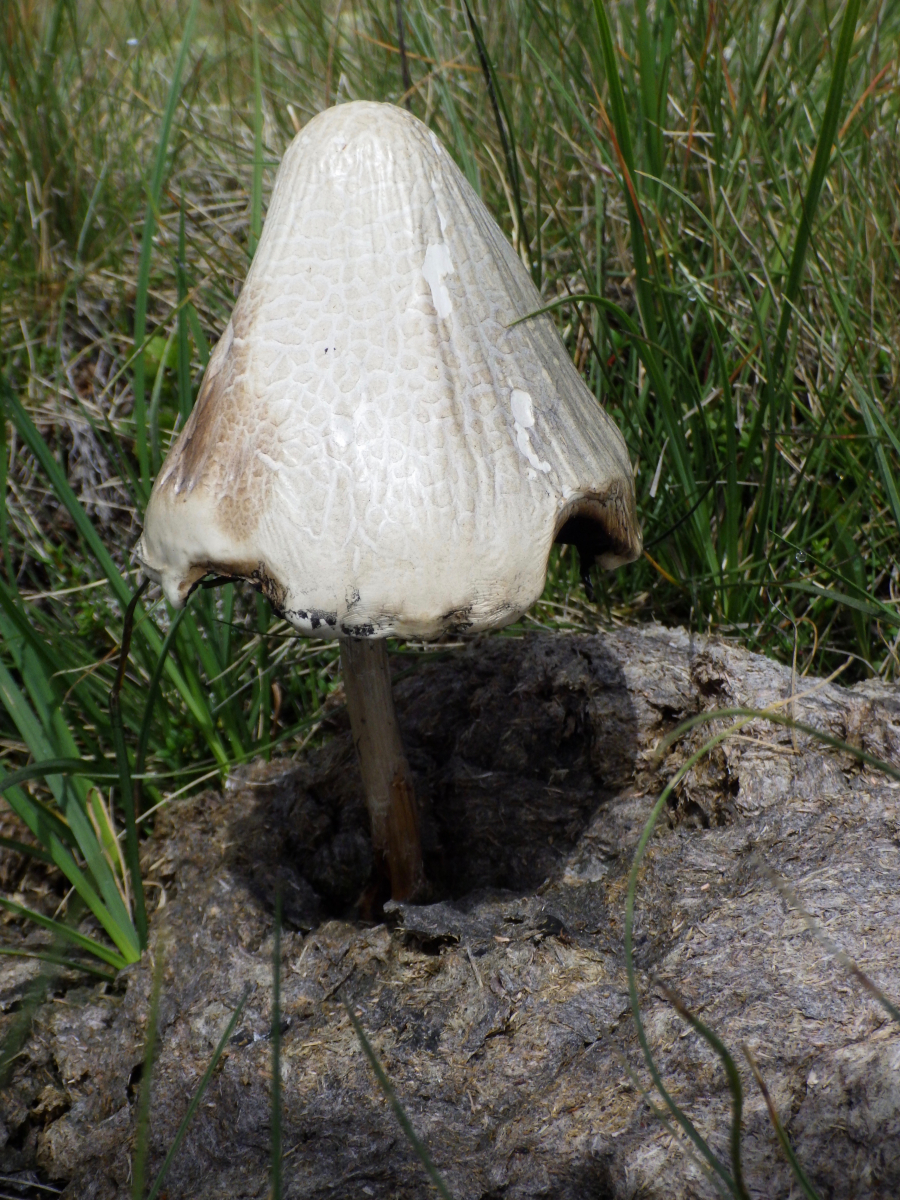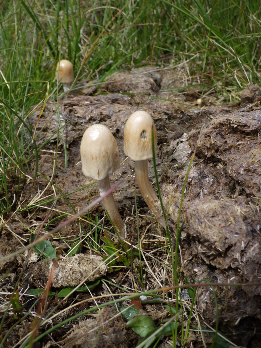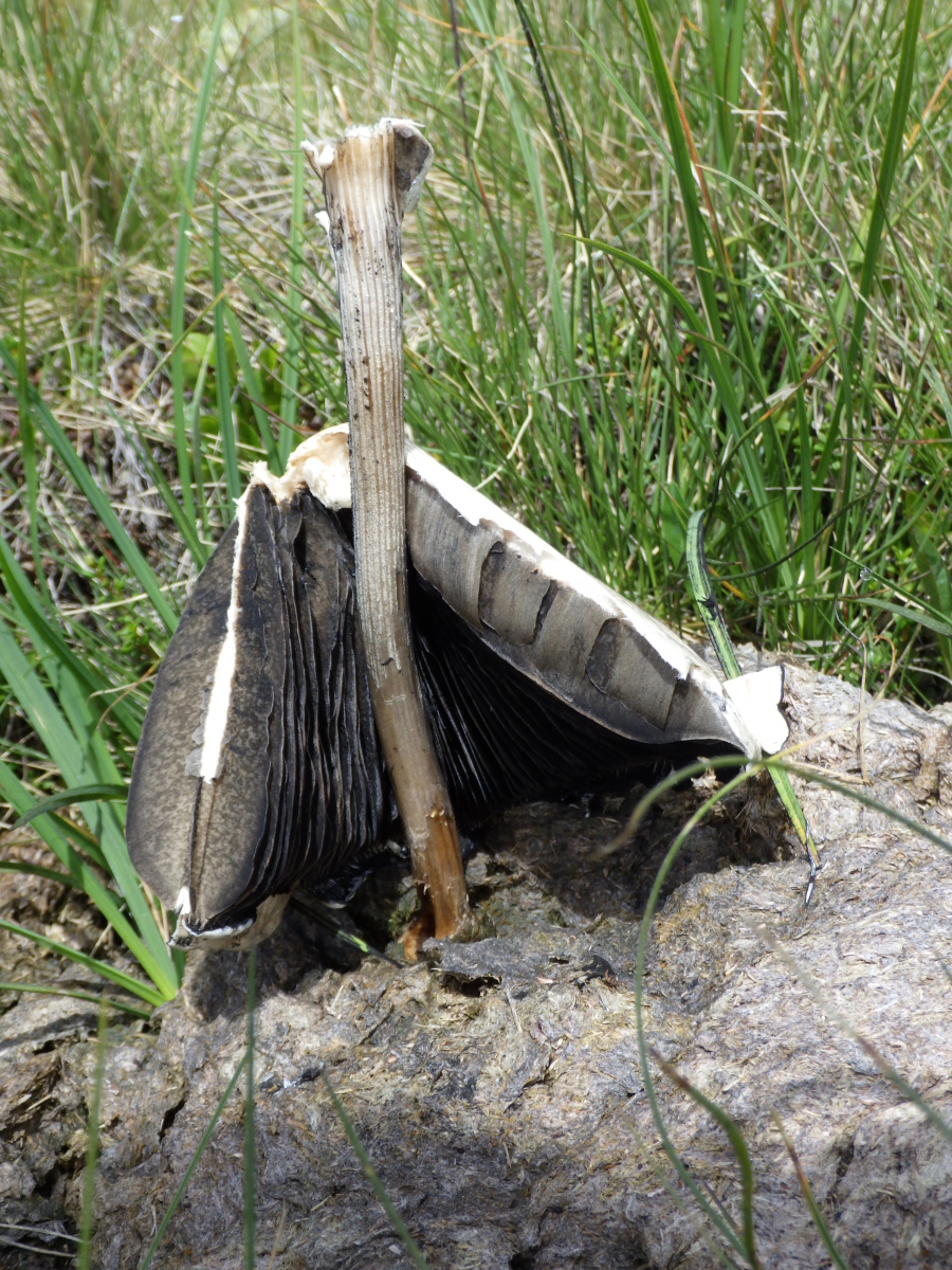 Letzte Woche war ich in den Bündner Bergen in der CH. Auf dem Crap Sion Gion oberhalb Laax auf 2250m hat es zur Zeit viele Kuhfladen mit wachsenden Pilzen. Sie sehen etwas ähnlich aus wie Tintlinge, ihre Lamellen und Hutränder werden auch schwarz. Der Stiel ist faserig, jung sind die Hüte beige, stellenweise hat es ringartige Ansätze, aber nicht auf allen Pilzen. Ich dachte zuerst an den beringten Düngerling oder ein Tintling. Kann man ihn bestimmen?