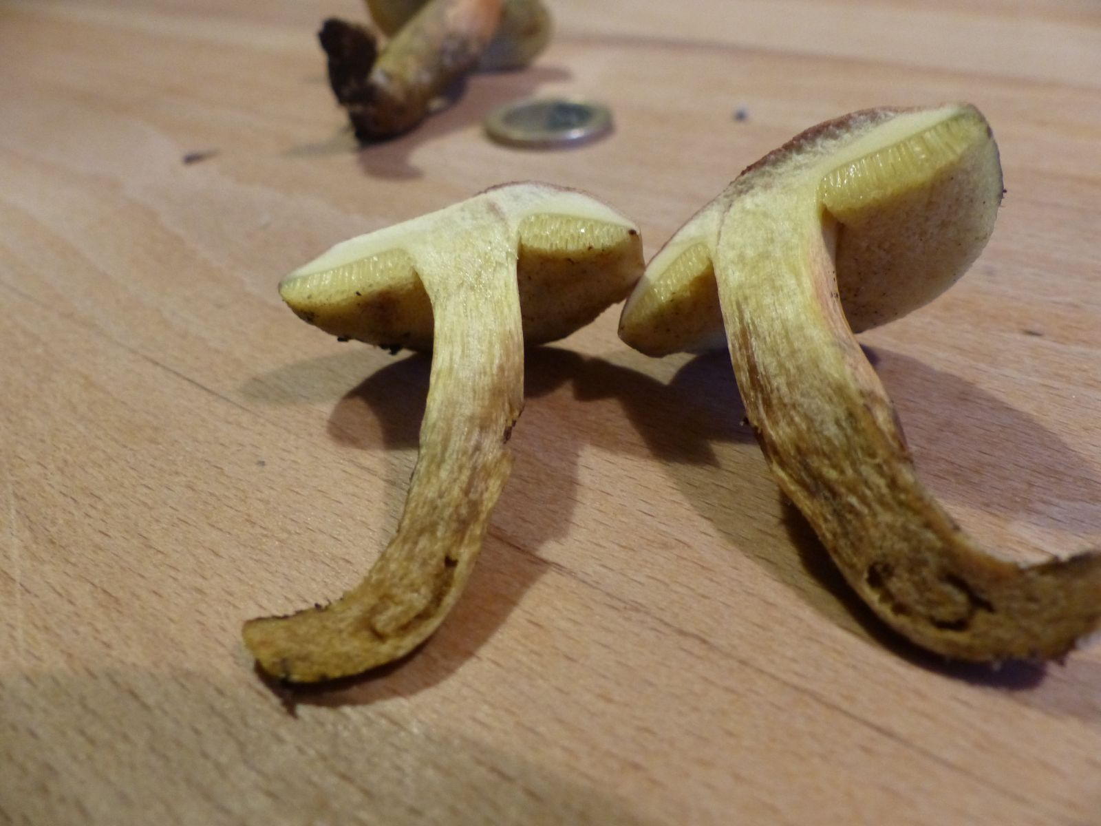 Fundort ganz ähnlich, ca. 500 Meter entfernt im Buchenwald. Und wieder hatte sich in 2 Meter Entfernung eine Eiche eingeschlichen. Zuerst dachte ich, dass wäre die gleiche Art, aber Fruchtkörper waren nicht so fest und Stil erheblich dünner. Röhrenöffnungen deutlich größer. Ebenfalls keine Blaufärbung auf Druck. Geschmack ebenfalls mild, vielleicht sogar etwas angenehmer. Und keine Rotfärbung im Schnittbild, sondern eher Dunkelfärbung.