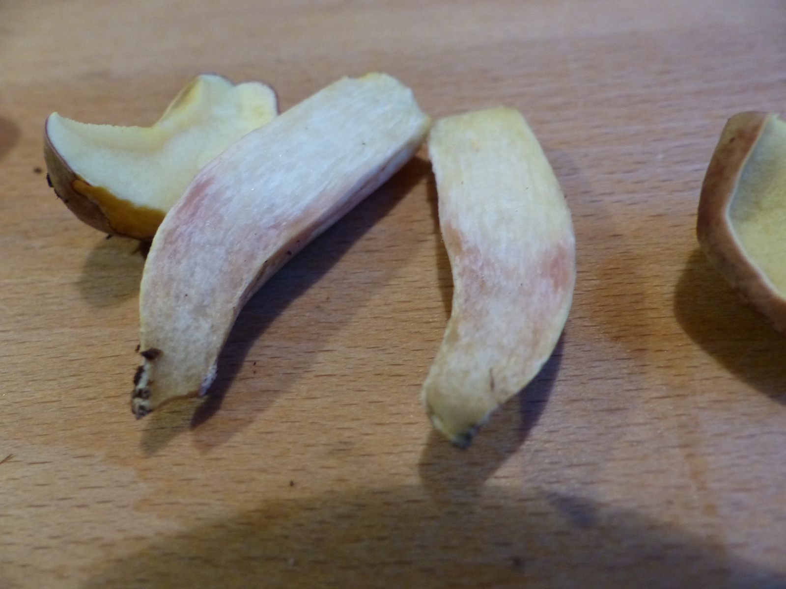 Fundort ganz ähnlich, ca. 500 Meter entfernt im Buchenwald. Und wieder hatte sich in 2 Meter Entfernung eine Eiche eingeschlichen. Zuerst dachte ich, dass wäre die gleiche Art, aber Fruchtkörper waren nicht so fest und Stil erheblich dünner. Röhrenöffnungen deutlich größer. Ebenfalls keine Blaufärbung auf Druck. Geschmack ebenfalls mild, vielleicht sogar etwas angenehmer. Und keine Rotfärbung im Schnittbild, sondern eher Dunkelfärbung.