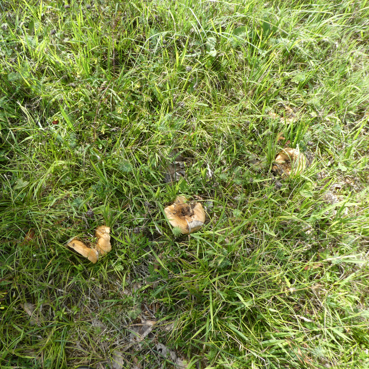Nachdem ich heute Nachmittag sowieso in der Nähe des Fundortes war bin ich da noch einmal hin. Die mittleren Pilze (einen davon habe ich durchgeschnitten) haben einen Durchmesser von ca. 8 cm, die ganz großen sind ungefähr doppelt so groß. Genau dort stehen in der Nähe Rotbuchen, Kiefern, weitere Laubgewächse und Eichen. Irgend ein spezieller Geruch ist mir an den Pilzen nicht aufgefallen.