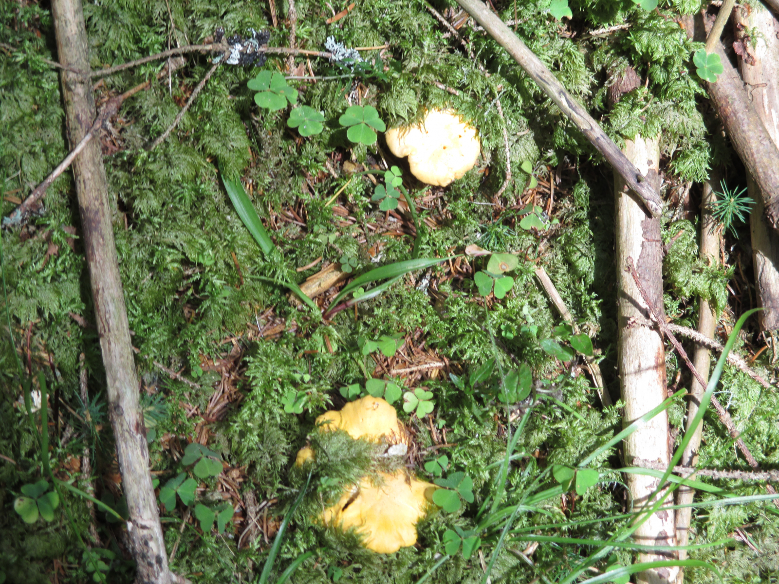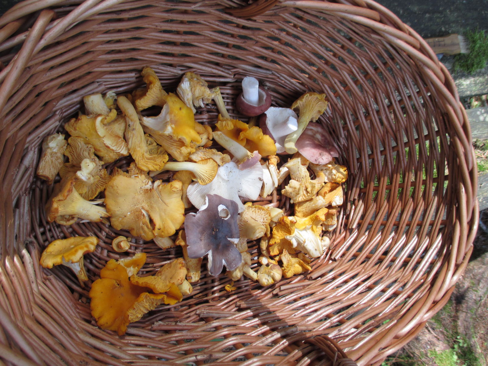 Zum Schluss der Blick in den kaum gefüllten Korb, Cantharellus cibarius, Cantharellus amethysteus, Russula vesca, Russula cyanoxantha.